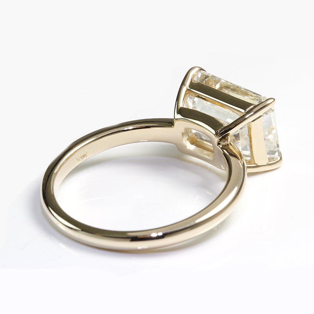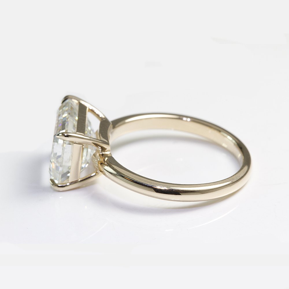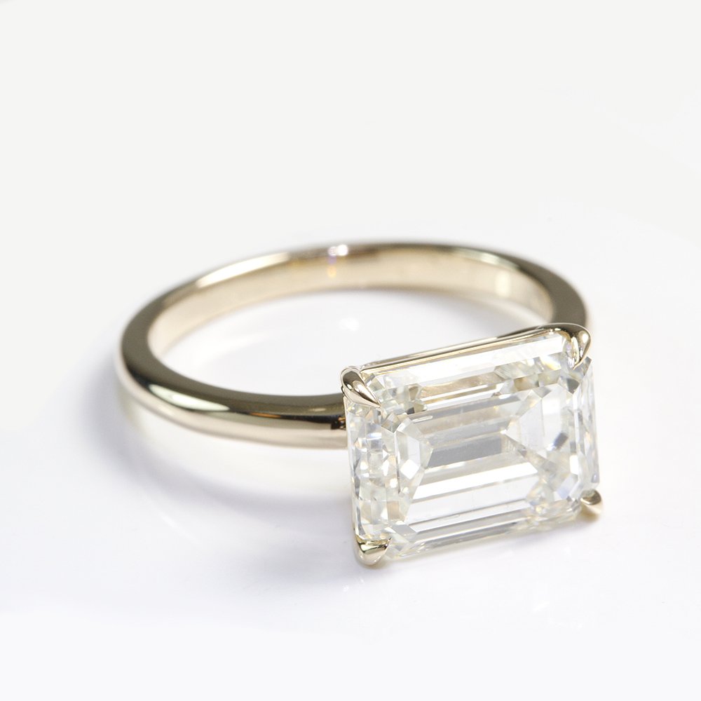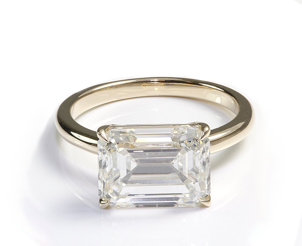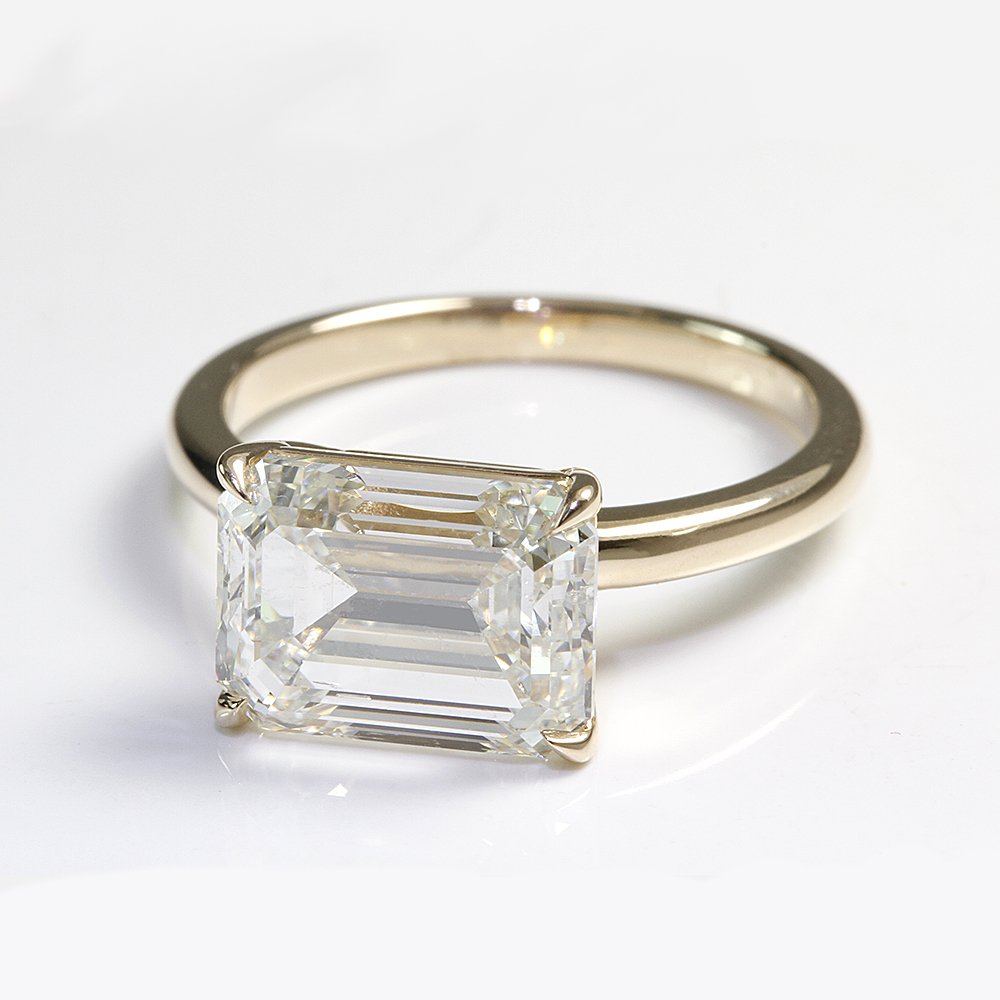 The East to West solitaire diamond engagement ring setting displays your diamond horizontally and is customized to the exact measurements of your center stone. Compatible with any center stone shape, this setting features a rounded comfort-fit band. The center diamond is mounted in a basket setting with claw prongs to create a sharp and minimalist design.