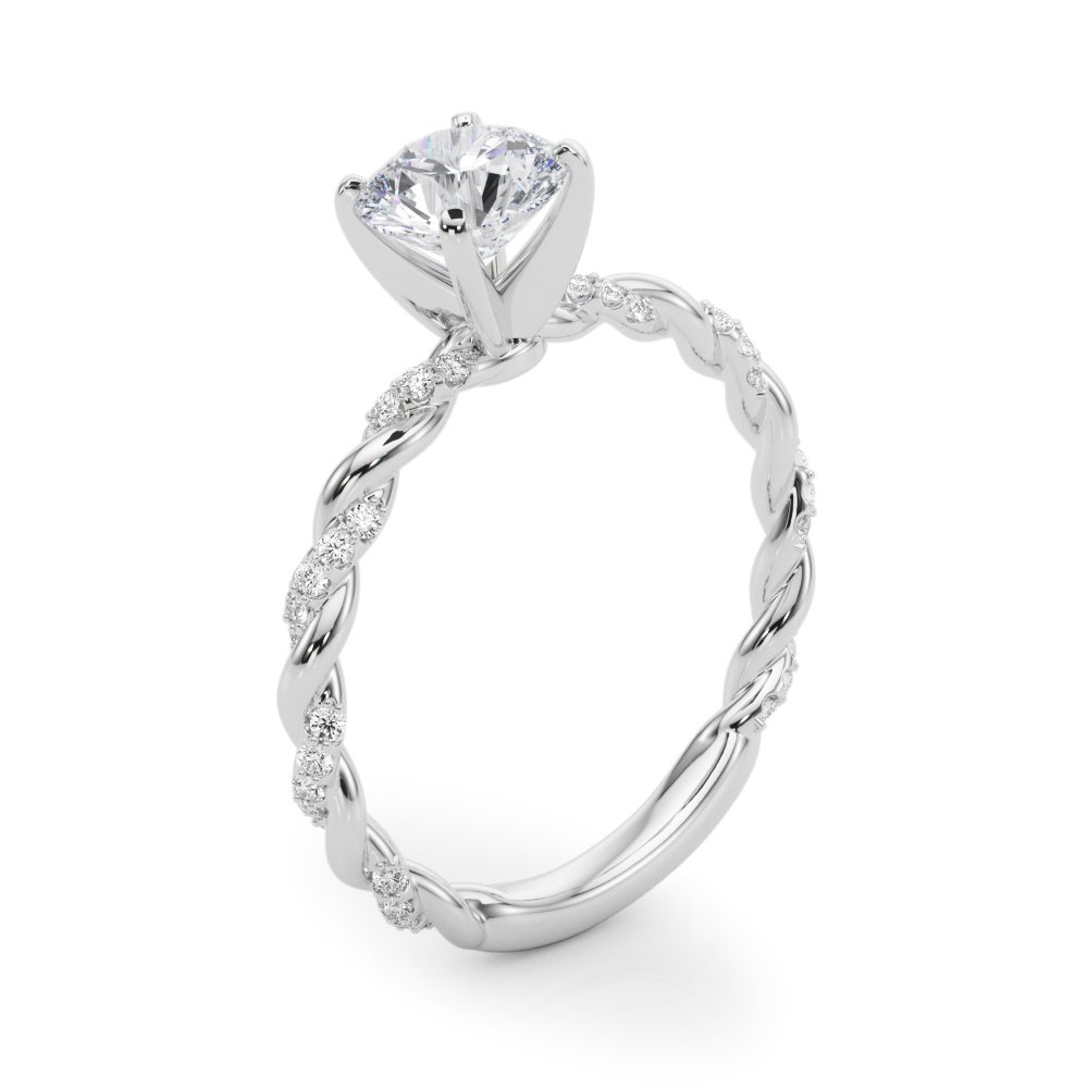 The Ella Diamond Engagement Ring features an round center diamond set on a twisted rope-style band. Interwoven with the metal are clusters of small round diamonds, creating a soft contrast between the polished twist and the sparkle of the stones. The band’s braided design adds dimension and texture while maintaining a balanced and structured form. This ring blends classic detailing with a modern silhouette for a refined and distinctive look.