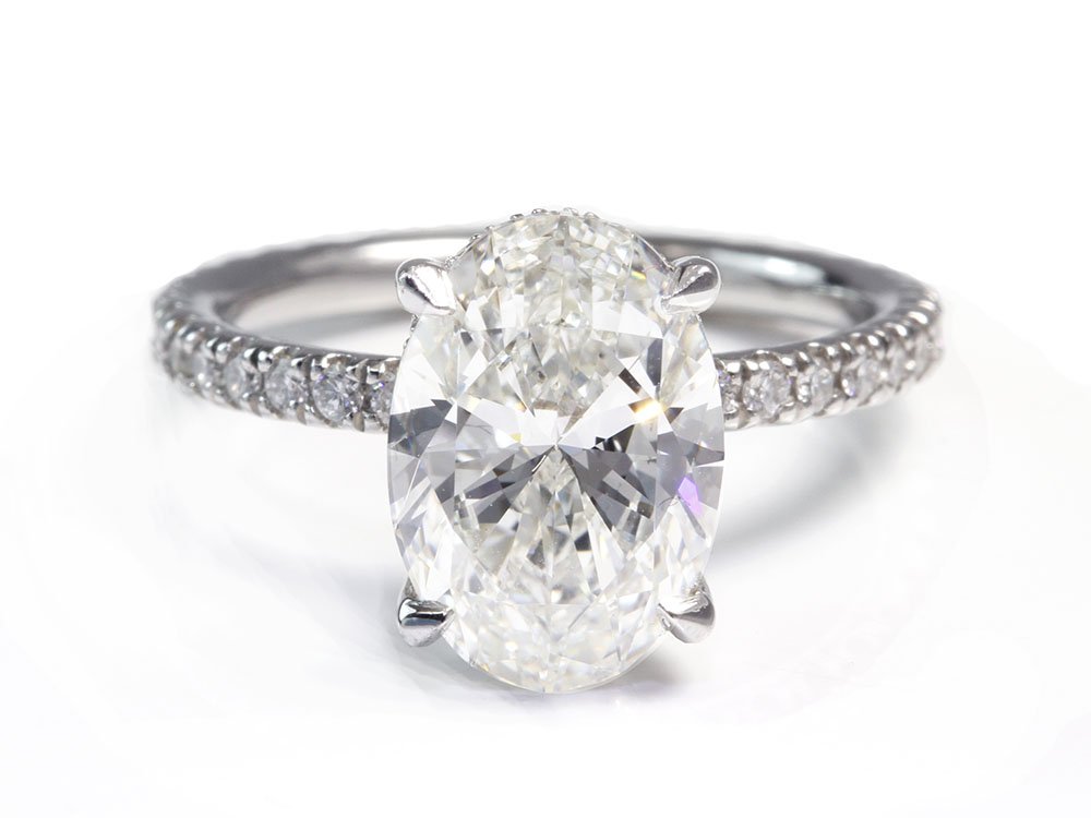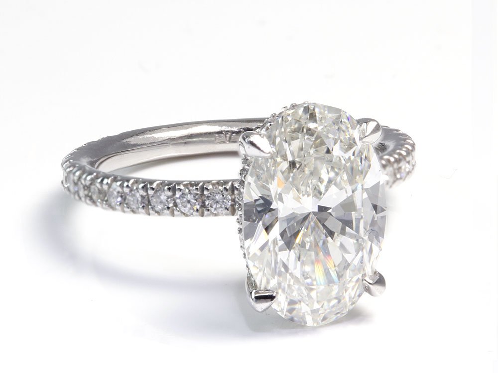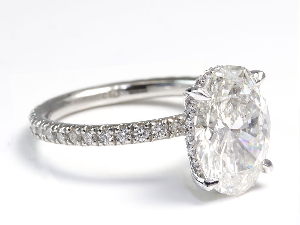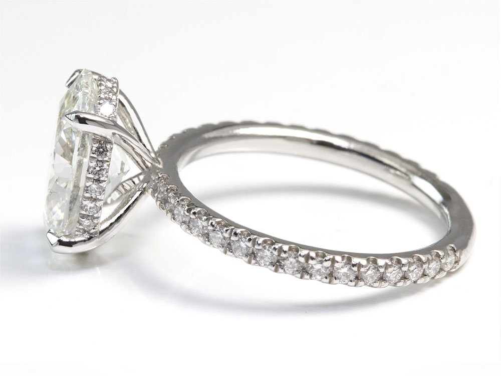 A spin off from the original Eliana, this Eliana Two features the same exact band with pave-set diamonds going 3/4 down the band and a hidden halo silhouetting the bottom portion of your diamond. The only difference is that the Eliana Two does not feature diamonds going up the prongs.