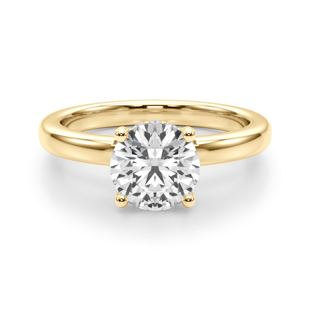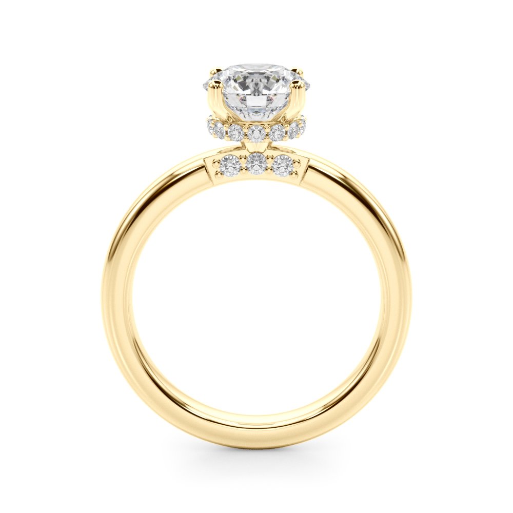 The Esme Diamond Engagement Ring is a sophisticated solitaire with intricate hidden details that elevate its elegance. A round or cushion-cut center diamond is cradled in a diamond-encrusted basket, with a delicate hidden halo and a surprise row of pavé-set diamonds tucked beneath the setting for added brilliance. The polished band offers a clean, classic look from the top, while the side profile reveals an ornate under-gallery that sparkles with quiet luxury. Crafted in your choice of precious metals, the Esme ring is perfect for those who love timeless style with an artful twist.