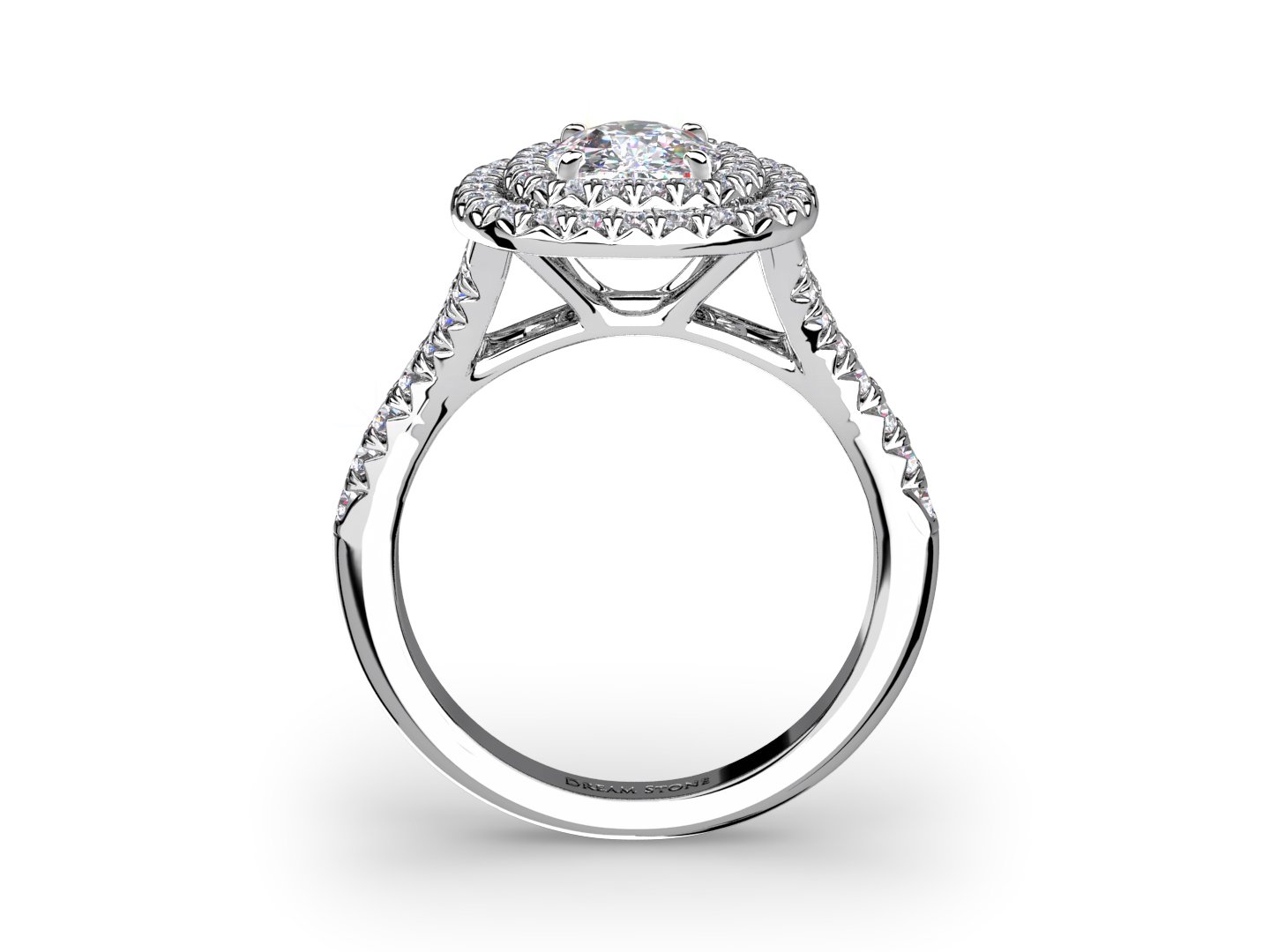 The Febe double halo diamond engagement ring is the crown jewel of engagement rings. Two rows of pave-set diamonds encircle your center stone. A split shank slopes upwards to create a dramatic design that exudes brilliance and fire. Available in 14k or 18k in white gold, yellow gold, rose gold, or platinum. (We do not engraved the DreamStone logo on the inside of the band)