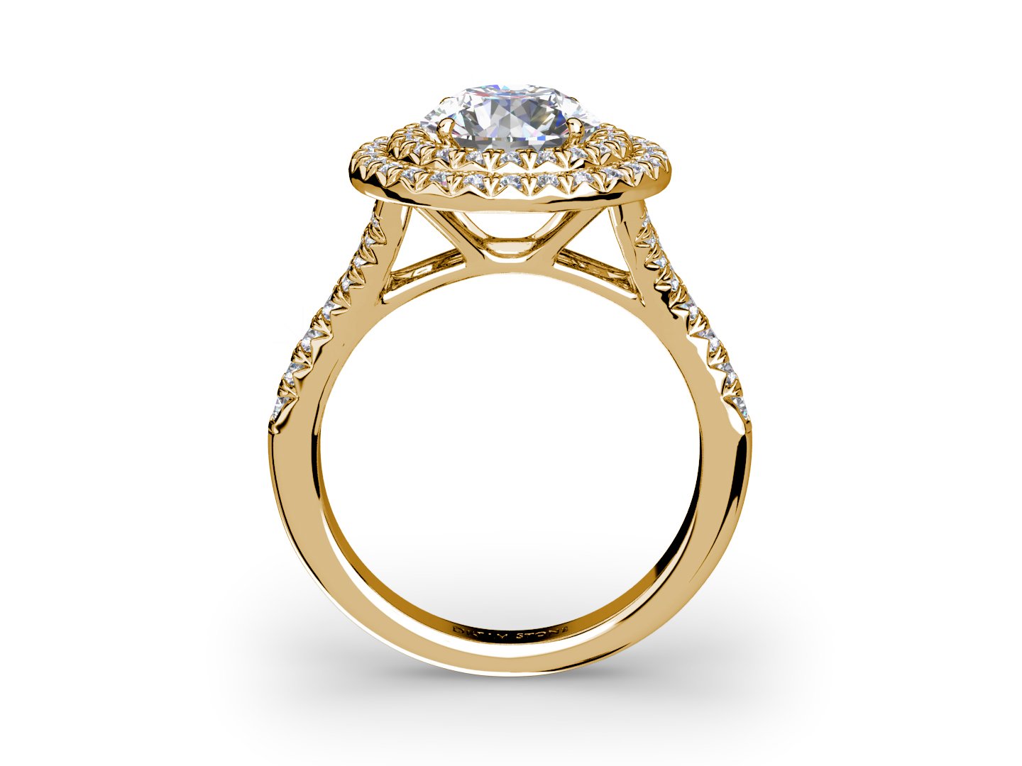 The Febe double halo diamond engagement ring is the crown jewel of engagement rings. Two rows of pave-set diamonds encircle your center stone. A split shank slopes upwards to create a dramatic design that exudes brilliance and fire. Available in 14k or 18k in white gold, yellow gold, rose gold, or platinum. (We do not engraved the DreamStone logo on the inside of the band)