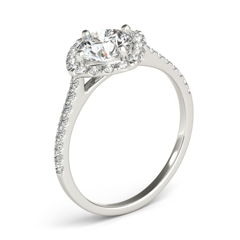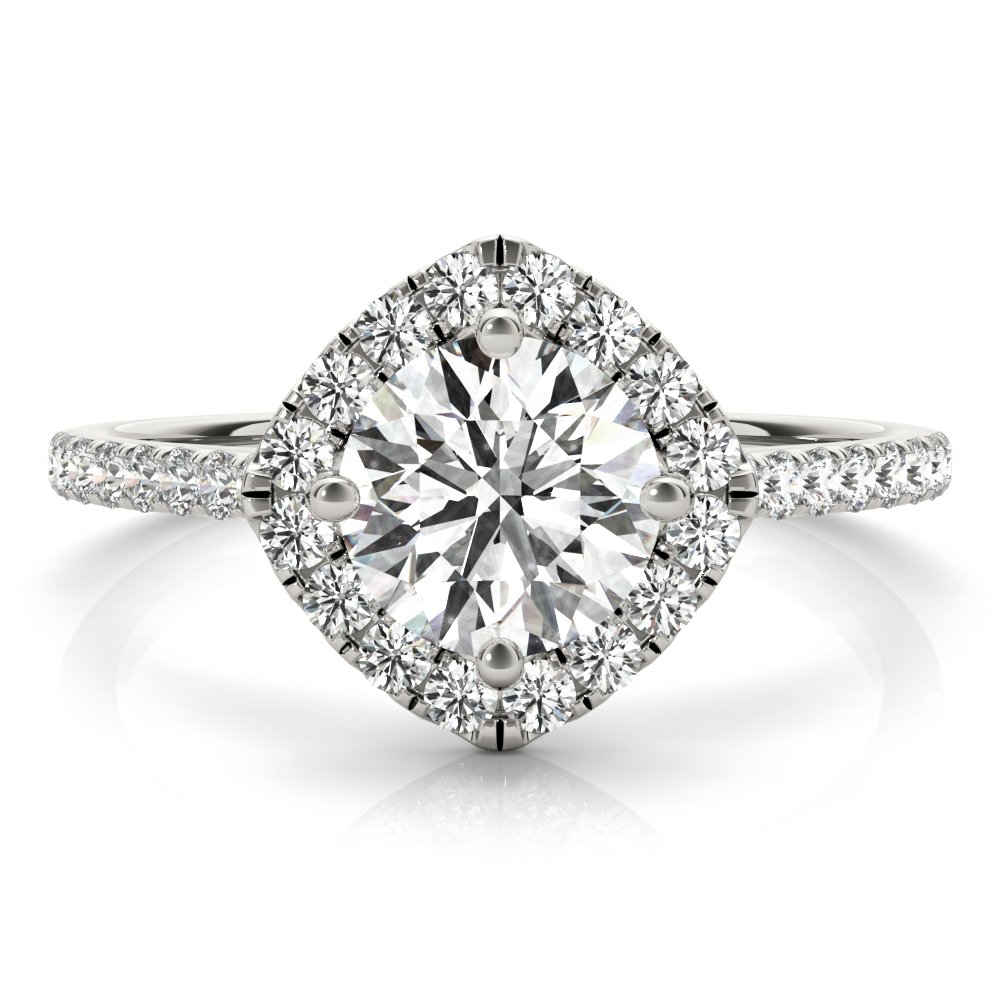 The Flora Diamond Engagement Ring features a cushion-shaped halo of round brilliant accent diamonds encircling a round center stone, creating a striking balance of vintage charm and modern brilliance. The halo is elevated on a sleek, high-polish band that tapers gently for a refined silhouette. Crafted in platinum or gold, the setting is designed to maximize light reflection, enhancing the sparkle of both the halo and center stone. This ring accommodates a round center diamond and offers a delicate yet dramatic look with its cushion halo contour and fine craftsmanship.