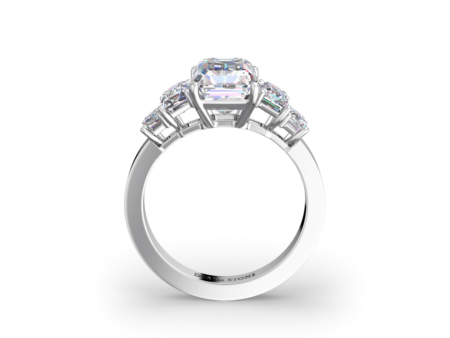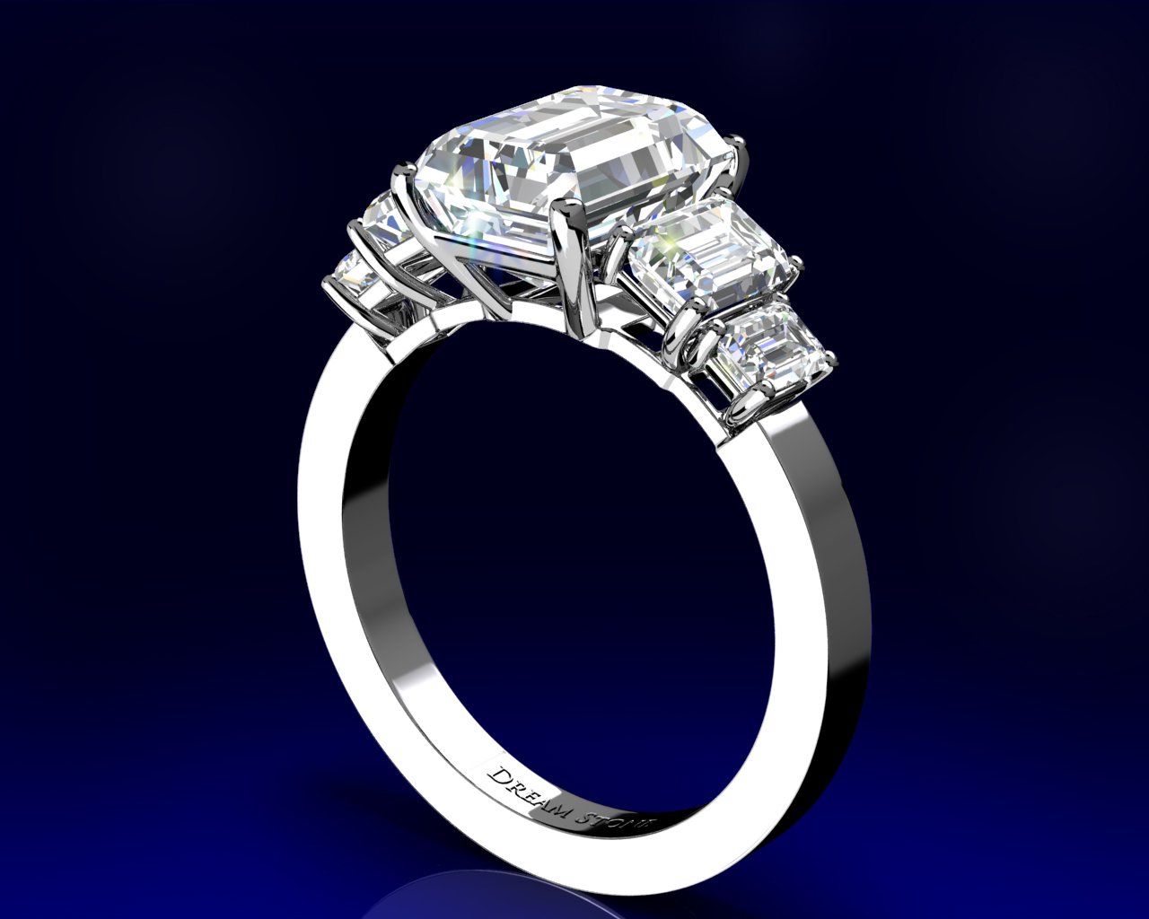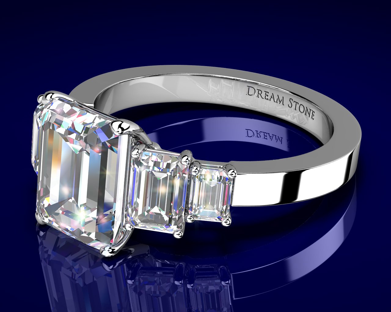 The Emerald diamond engagement ring is the perfect setting for emerald loves. With four emeralds flanking your choice of center diamond, this setting is all glamor and brilliance. (DreamStone logo is not engraved on the inside of the band). If you prefer, the band can be made with a rounded edge design.