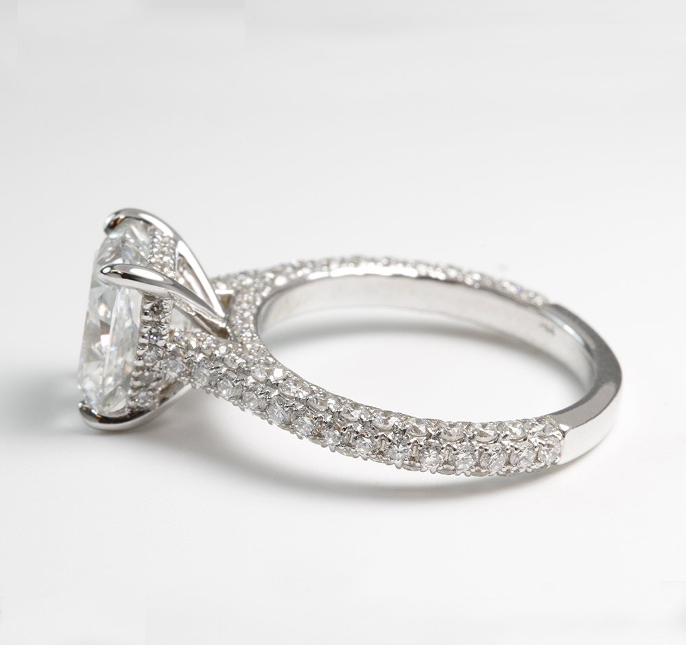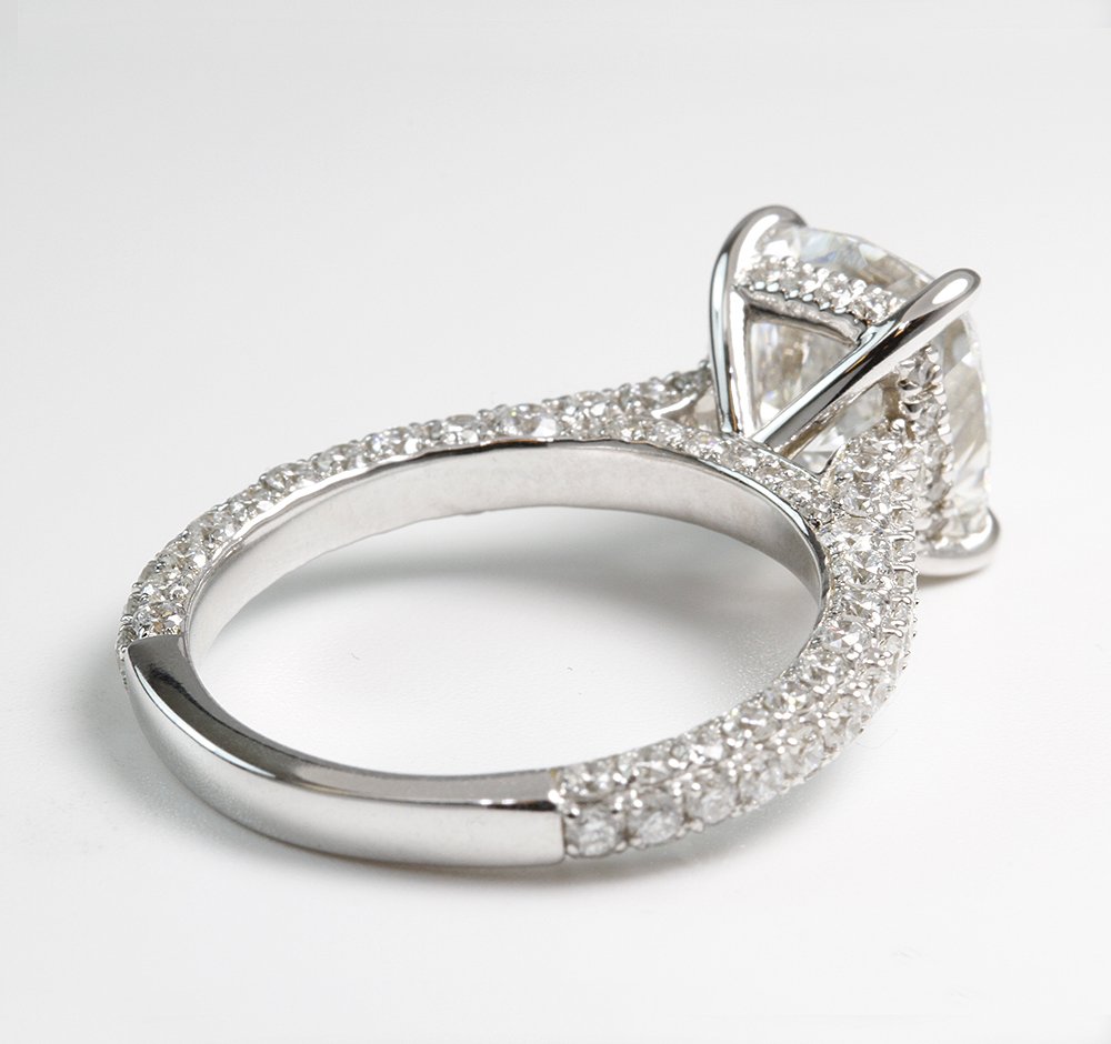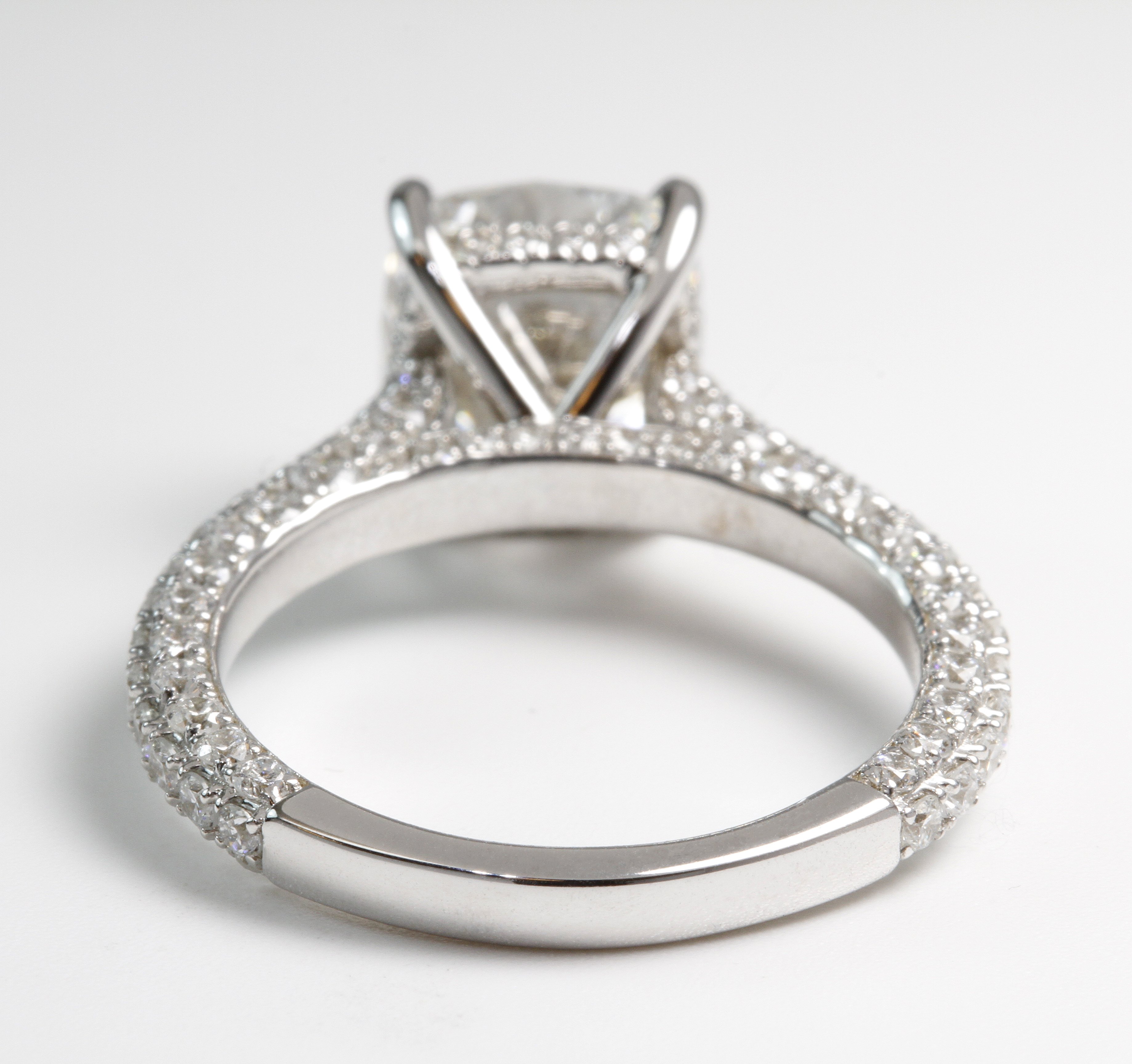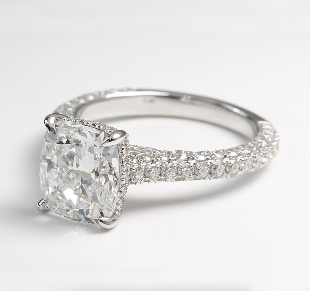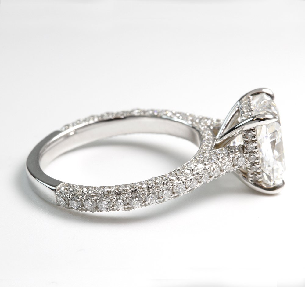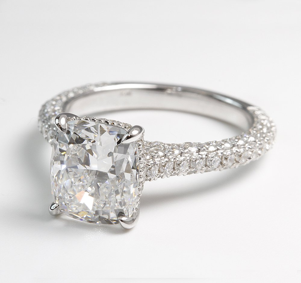 The Gabrielle Diamond Engagement Ring is truly a work of art. This cathedral pave setting features round brilliant diamonds on three sides of setting. A hidden halo silhouettes your center stone. A wedding band would sit flush against this setting. Complete this ring with your choice of center diamond, ring size, and metal preference.