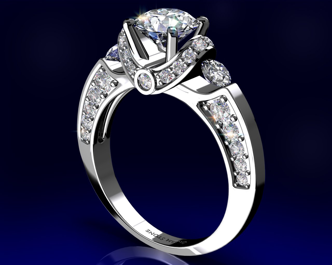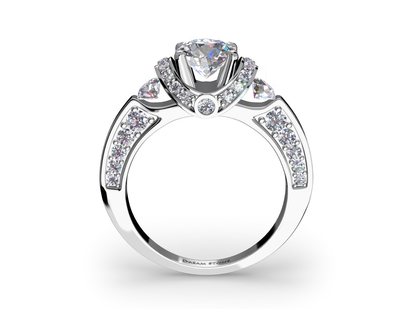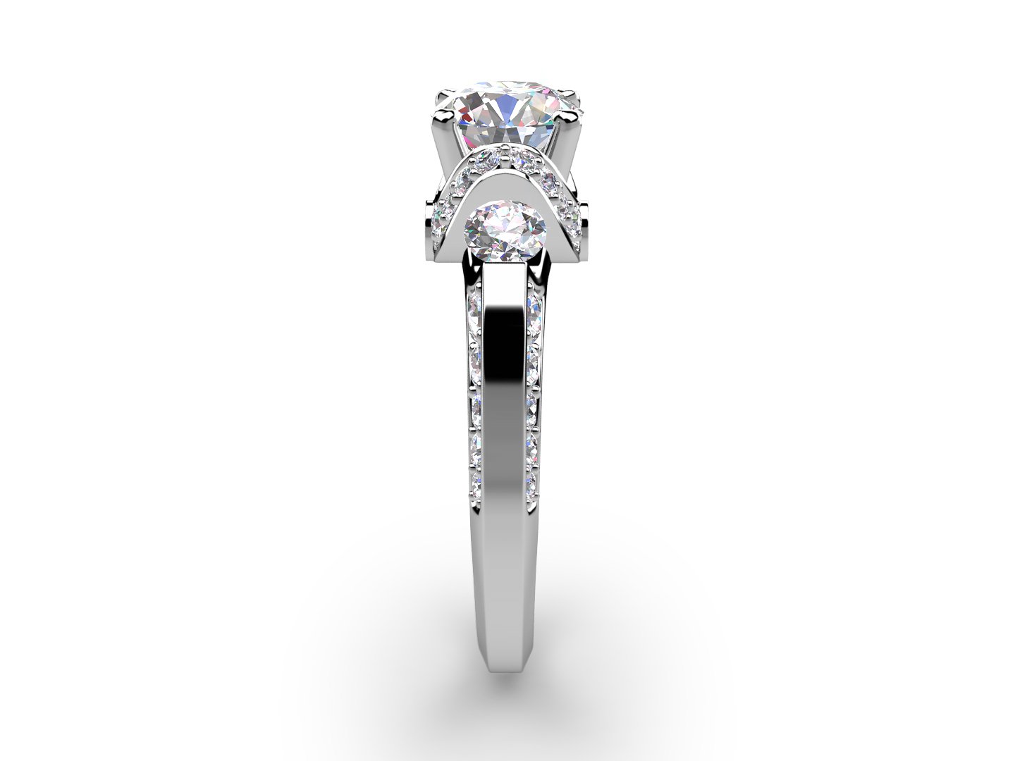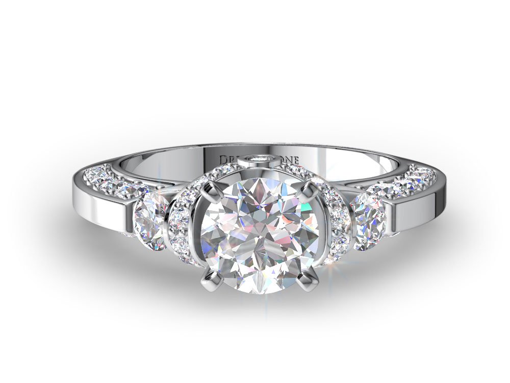 The Harlow diamond engagement ring is a masterpiece design crafted with striking features. Round brilliant diamonds flow around your center diamond with two larger stones suspended in a tension type mounting on either side. The final stroke of brilliance is complimented by diamonds on both sides of the band. Complete this setting with your choice of center diamond and preferred metal.