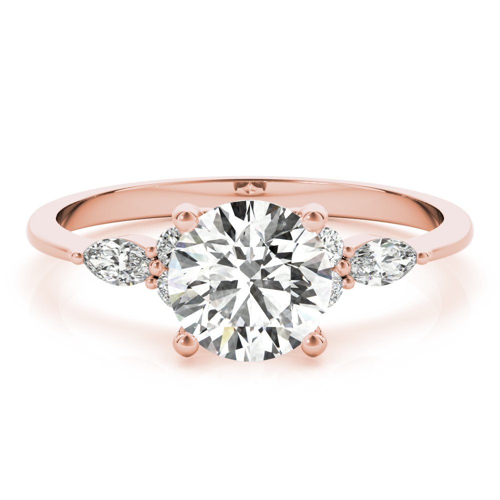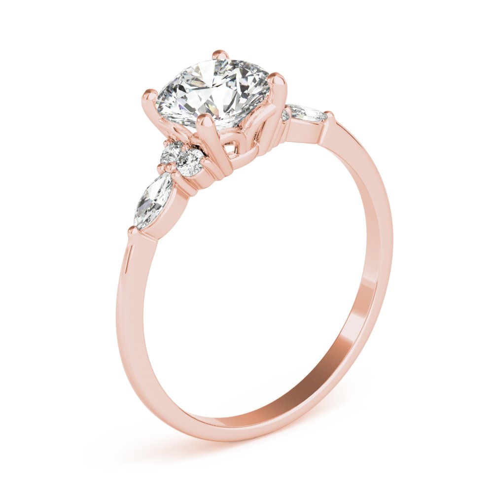The Helena Engagement Ring is a romantic design that captures both brilliance and grace. A dazzling round brilliant diamond takes center stage, cradled in a secure four-prong setting. On each side, marquise-shaped diamonds create a graceful, elongated frame, accented by petite round stones that add extra sparkle and depth. The sleek, polished band draws the eye to the artistry of the setting, balancing elegance with modern refinement. With its unique blend of symmetry and delicate detailing, the Helena is a timeless choice for those who want an engagement ring that feels both classic and distinctive.