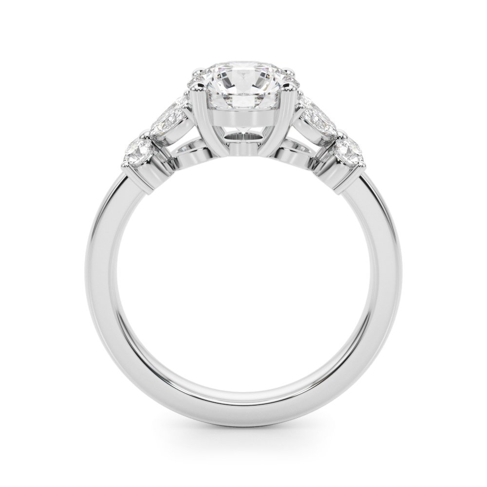 The Jade Diamond Engagement Ring features a central diamond accented by four marquise-cut diamonds set on the band—two on each side. The marquise stones are positioned to create a subtle butterfly-like effect, adding a distinctive visual element to the ring. Their tapered shape draws attention to the center stone while introducing a refined, symmetrical detail to the band’s profile. The design offers a clean and structured look with a unique silhouette.