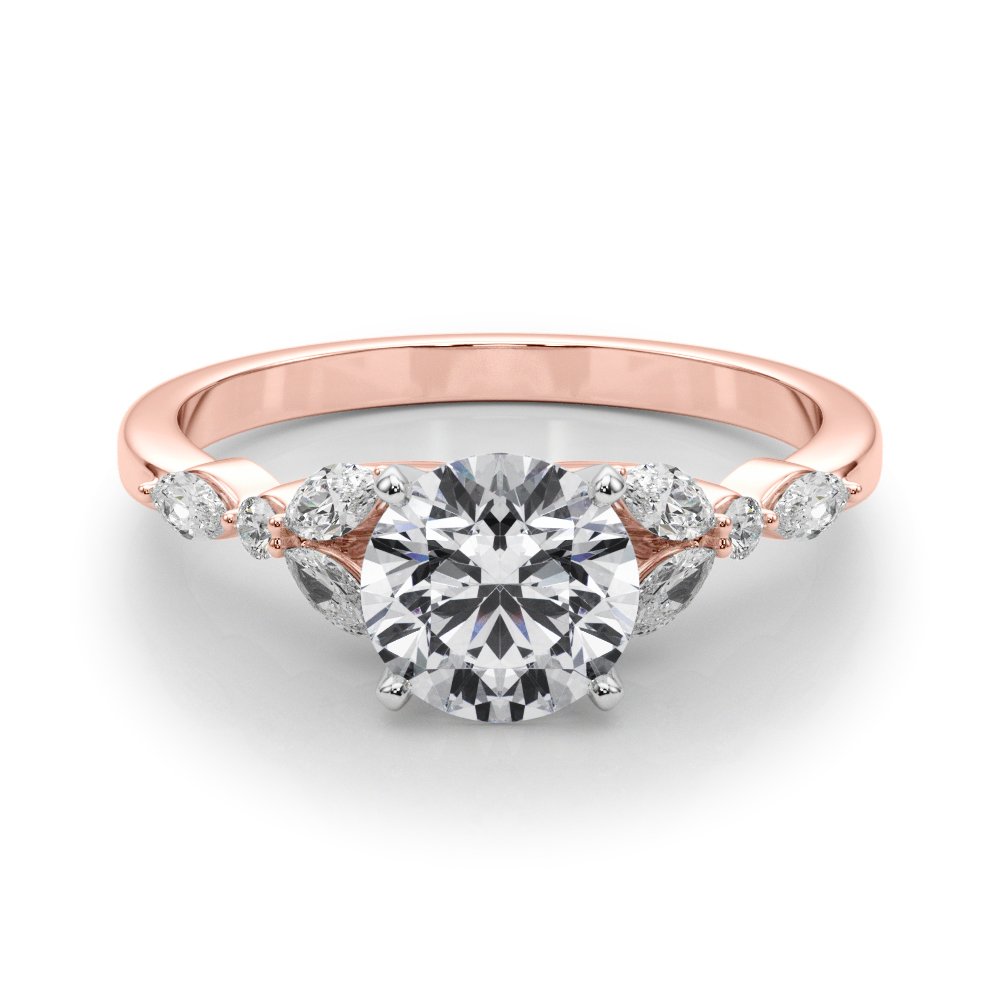 The Josie Diamond Engagement Ring features a captivating design with a trio of accent stones on each side of the center diamond. Two marquise-cut diamonds are elegantly set on the band, separated by a single round brilliant diamond, creating a symmetrical and balanced look. This distinctive arrangement adds a touch of vintage charm while maintaining a modern elegance, drawing the eye along the band and toward the center stone.