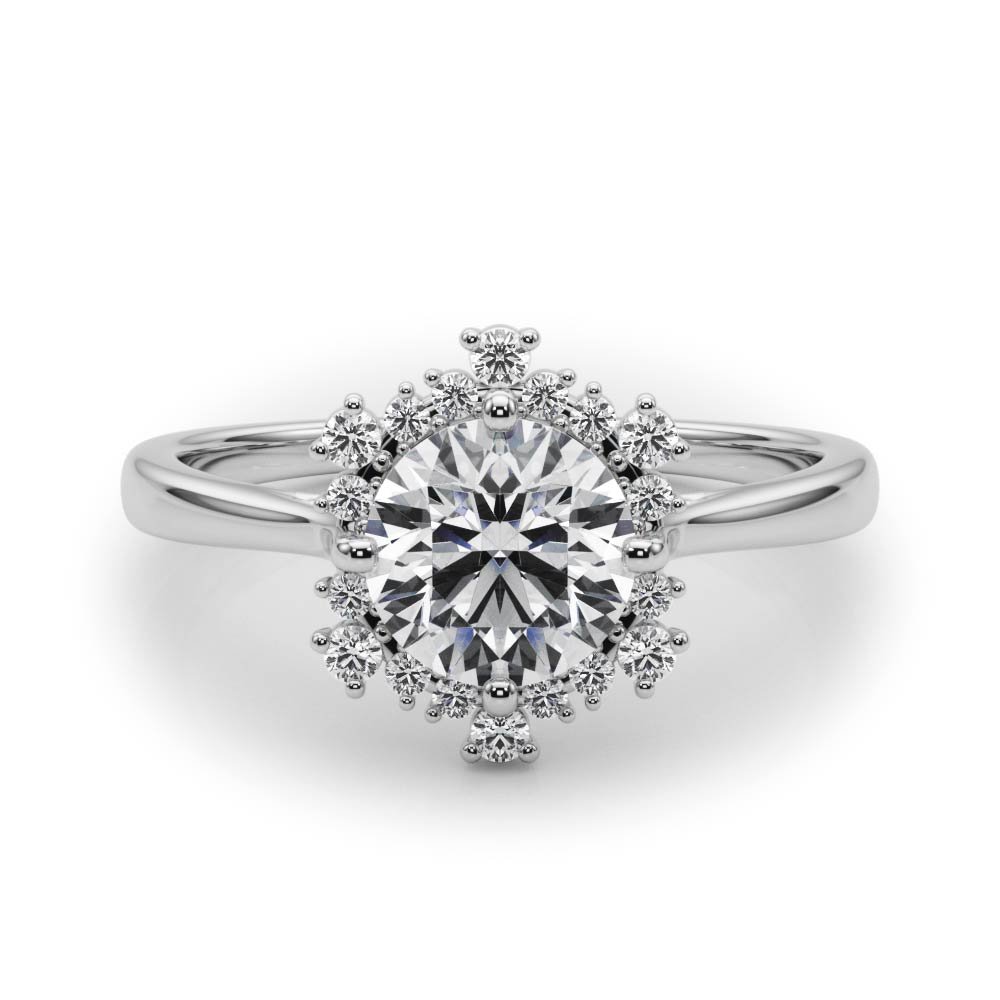 The Kaia Diamond Engagement Ring showcases a round brilliant center diamond encircled by a halo of alternating single and clustered round diamonds, creating a radiant starburst effect. Set on a polished, split-shoulder band, this design maximizes brilliance from every angle while offering a bold, distinctive silhouette.