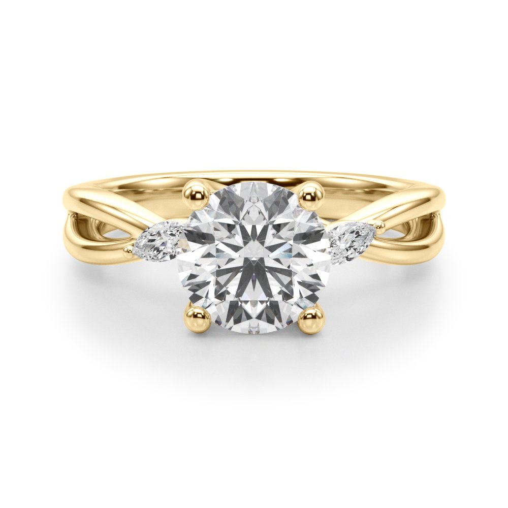 The Lacey Diamond Engagement Ring features a round brilliant center stone accented by two pear-shaped side diamonds that taper gracefully into a distinctive crossover band. The twisted shank design adds movement and modern elegance, while the delicate side stones enhance the brilliance and symmetry of the setting. Crafted in your choice of precious metals, the Lacey ring offers a unique yet timeless look—perfect for those who want a romantic style with an elegant twist