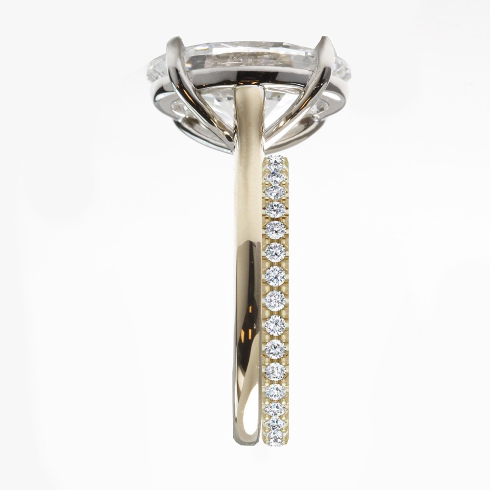 The Le Petit Cathedral engagement ring is a setting designed from our own client's aspirations - it features a cathedral band while also offering a flush fit with a wedding band. This setting can accommodate any center diamond shape of your choice. The band width comes a delicate 2 mm band that helps put all the attention on the main diamond. You can can customize the setting with a hidden halo.