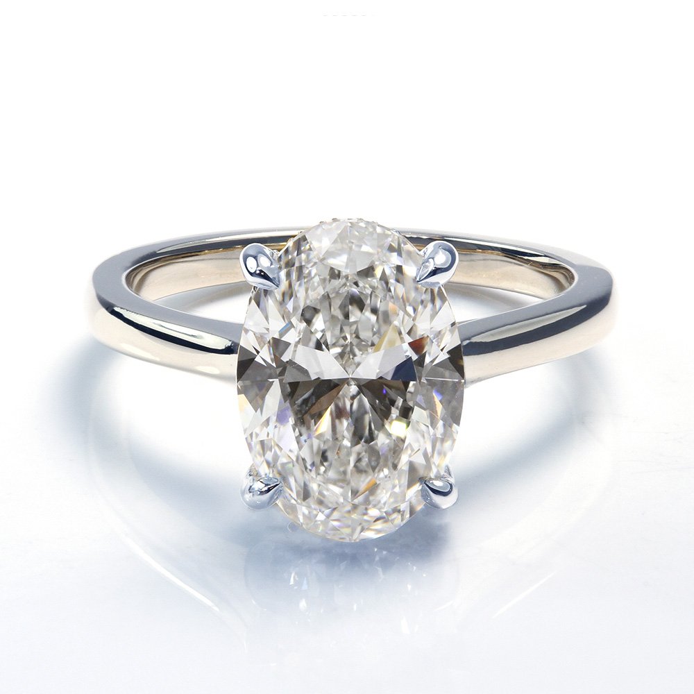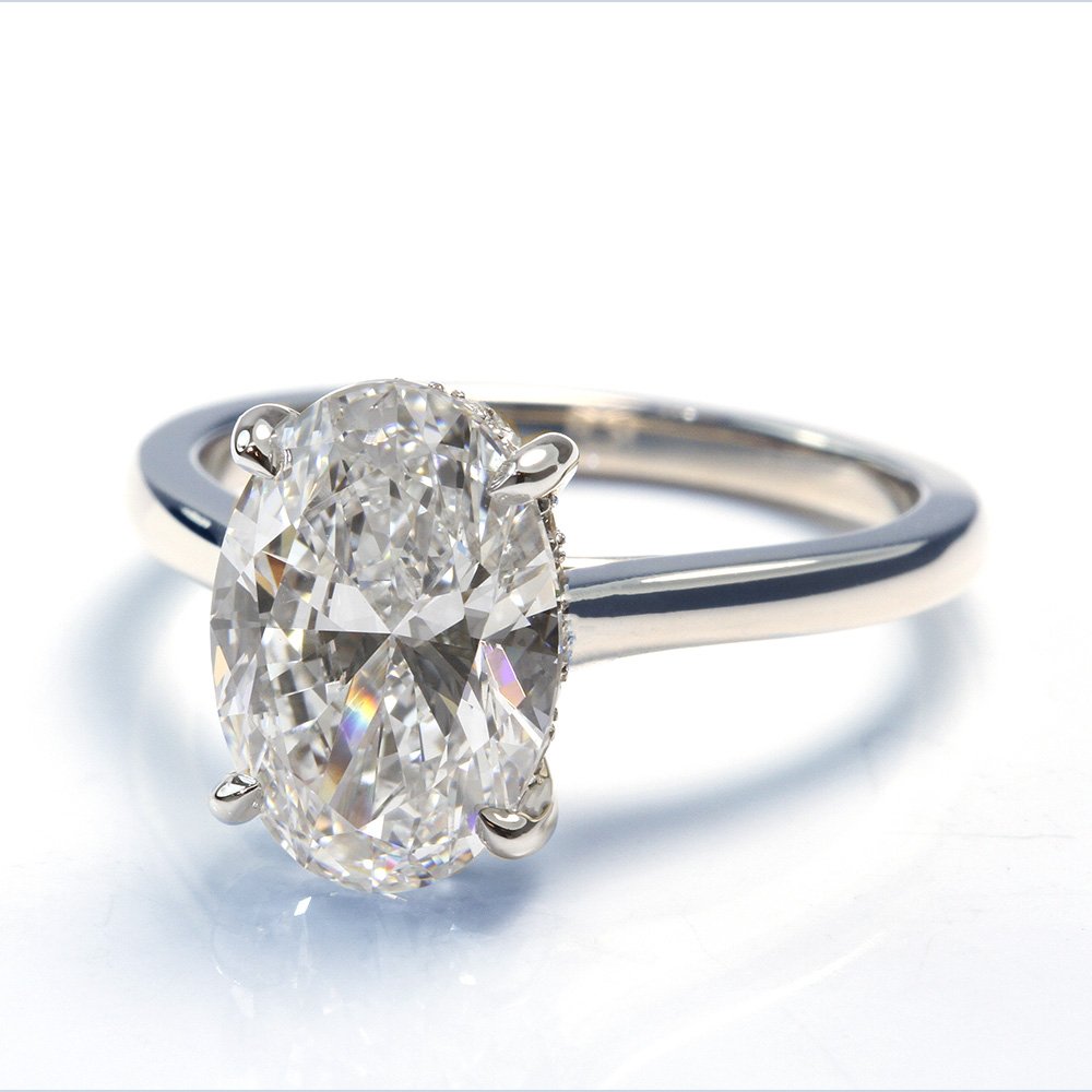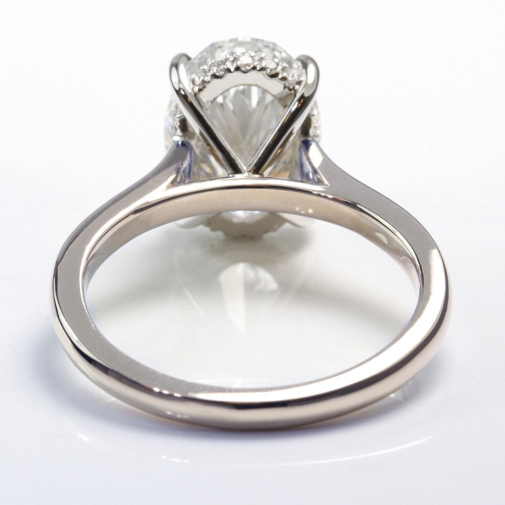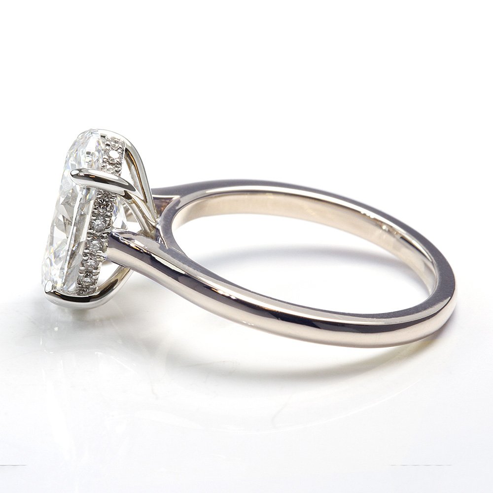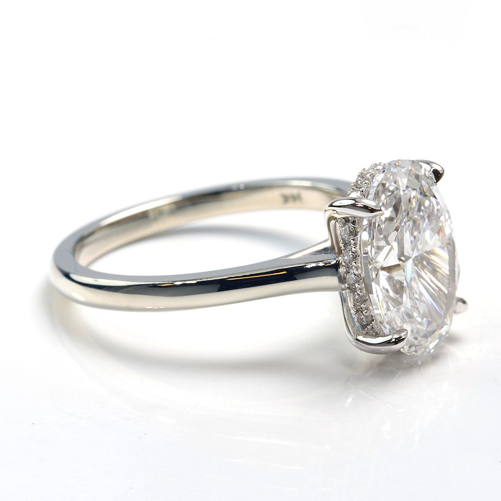 The Le Petit Hidden Halo Cathedral diamond engagement ring is a setting designed from our own client's aspirations - it features a hidden halo and a cathedral band while also offering a flush fit with a wedding band. This setting can accommodate any center diamond shape of your choice. The band width comes a delicate 1.9 mm band that helps put all the attention on the main diamond.