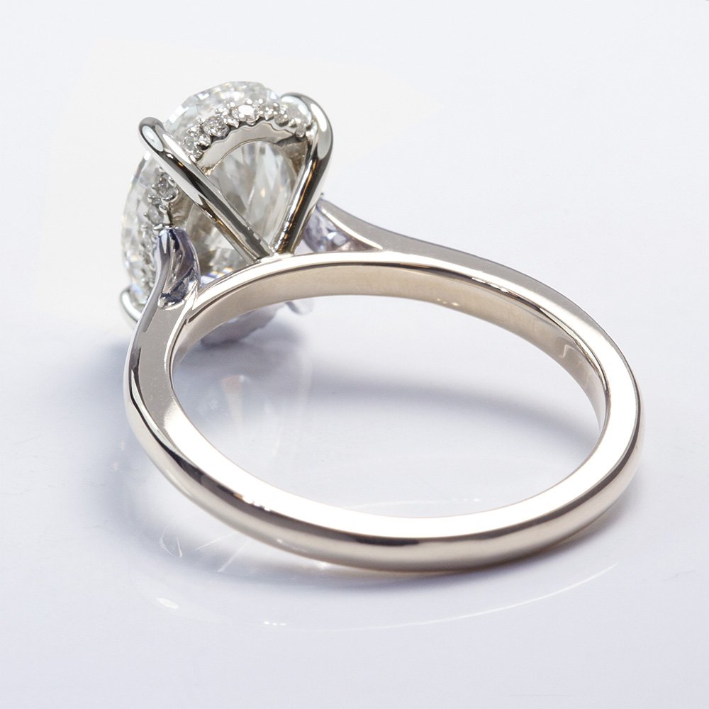 The Le Petit Hidden Halo Cathedral diamond engagement ring is a setting designed from our own client's aspirations - it features a hidden halo and a cathedral band while also offering a flush fit with a wedding band. This setting can accommodate any center diamond shape of your choice. The band width comes a delicate 1.9 mm band that helps put all the attention on the main diamond.