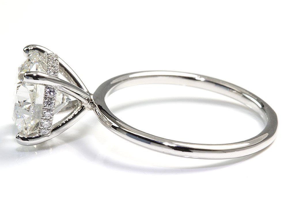 The Le Petit collection are all custom made to your center diamond's proportions. This setting features a hidden halo with pave-set diamonds to silhouette your diamond. The halo is not visible from the top, but provides a pleasant subtle accent when viewed from the sides. At 1.5 mm wide, the thin band highlights your diamond. Le Petit collection is also available with band thickness ranging from 1.4 to 2 mm wide. The version shown in this setting is 1.5 mm. If you prefer a different band thickness, just let us know at checkout and we'll make those adjustments free of charge.