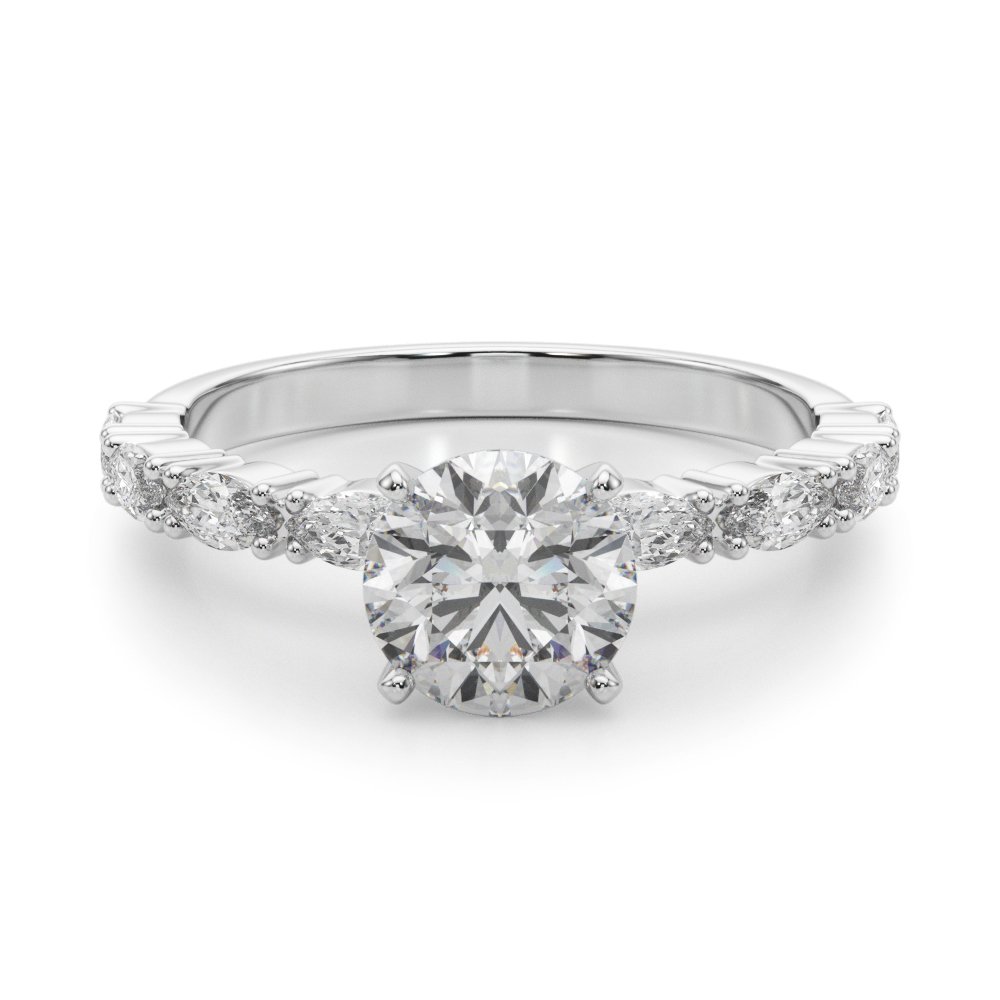 The Marquise Diamond Engagement Ring features a dazzling round brilliant center stone set atop a band adorned with alternating round and tapered baguette diamonds, creating a captivating blend of sparkle and texture. This unique combination of shapes gives the ring a modern edge while maintaining a timeless feel. The diamonds are expertly set for maximum brilliance, and the polished band ensures comfort and elegance. With its sophisticated silhouette and distinctive detailing, the Lena ring is perfect for those who want a classic look with a contemporary twist.