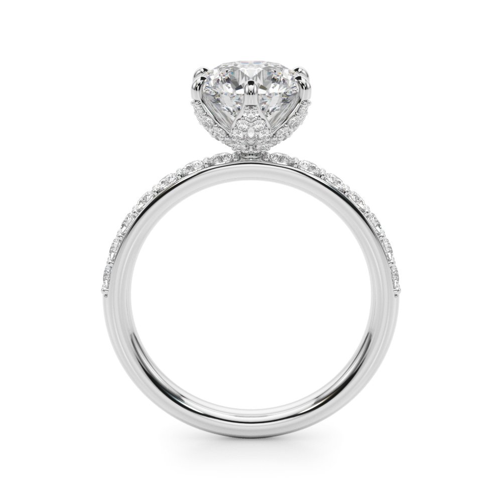 The Juliet Diamond Engagement Ring features a pavé-set band with round brilliant-cut diamonds extending halfway down the shank. The center stone is held in a four-prong Floral-type setting that accommodates any diamond shape or size. The basket is detailed with a diamond-accented gallery, designed for added brilliance and a refined profile view. This setting is compatible with all metal types, including platinum, 18k and 14k gold (white, yellow, or rose). Engineered for structural stability, the ring allows seamless pairing with most wedding bands while maintaining a balanced, elegant silhouette.