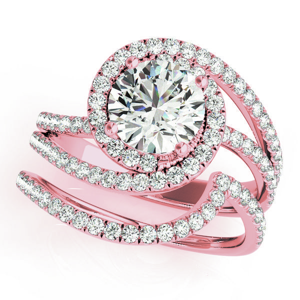 The Liora ring features a round brilliant-cut center diamond secured in a four-prong setting, encircled by a halo of smaller round diamonds. The band has a split-shank design, with each side lined with pavé-set diamonds that twist gracefully around the halo, creating a dynamic and flowing silhouette. This combination of the halo and twisting pavé band maximizes sparkle and adds a modern elegance to the overall design.