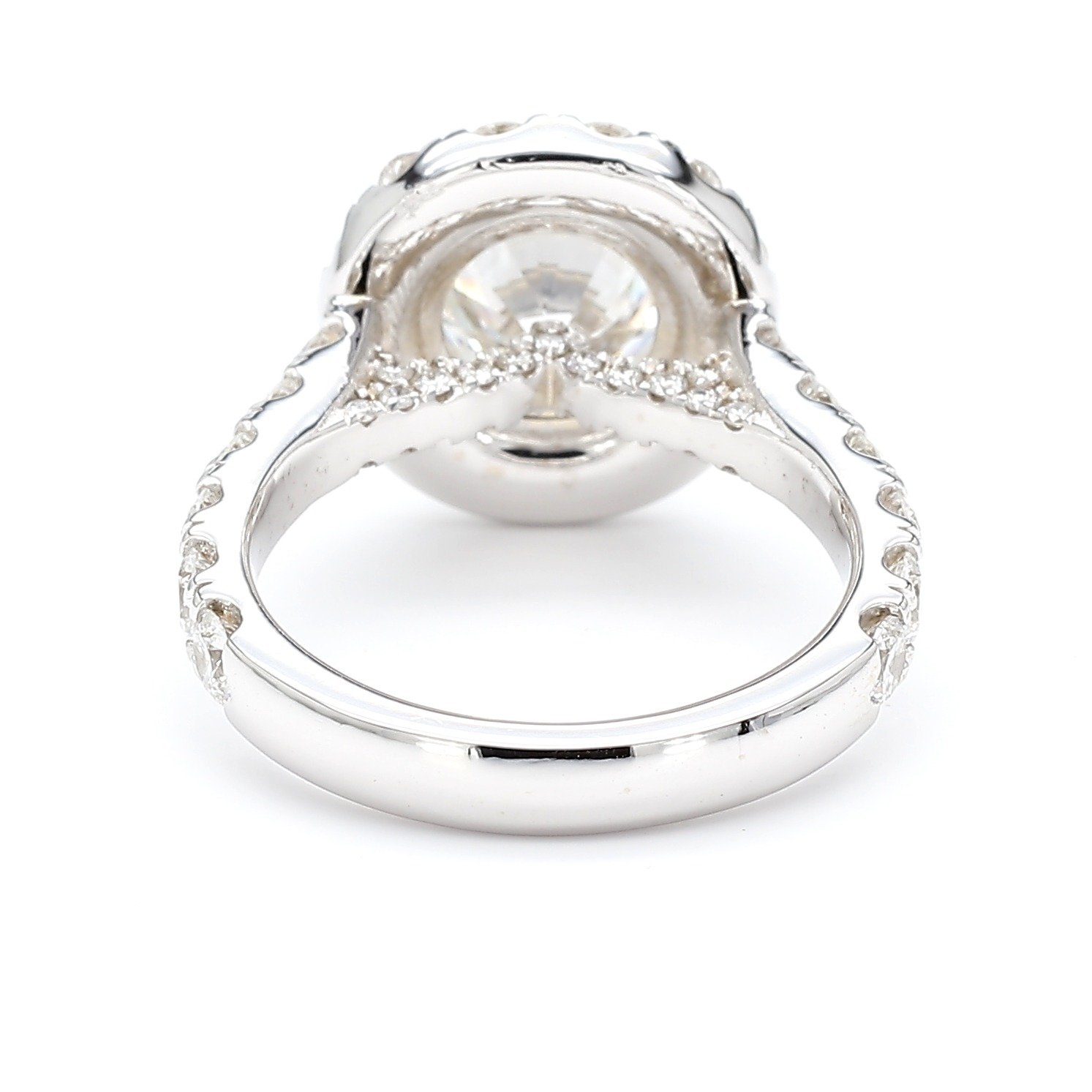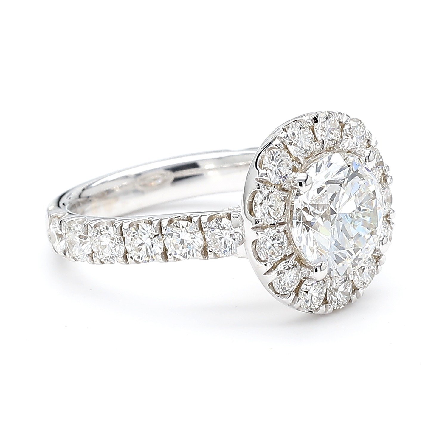 The Lucia Diamond Engagement Ring showcases timeless sophistication with its elegant design and exquisite craftsmanship. Set in high-polish platinum white/yellow gold, the ring features a brilliant round-cut center diamond encircled by a delicate halo of pavé-set diamonds that amplify its sparkle. The band is adorned with a row of meticulously matched round diamonds extending halfway down the shank, offering a seamless display of brilliance. The open gallery and cathedral-style shoulders add depth and light performance, creating a refined balance between classic beauty and modern allure.