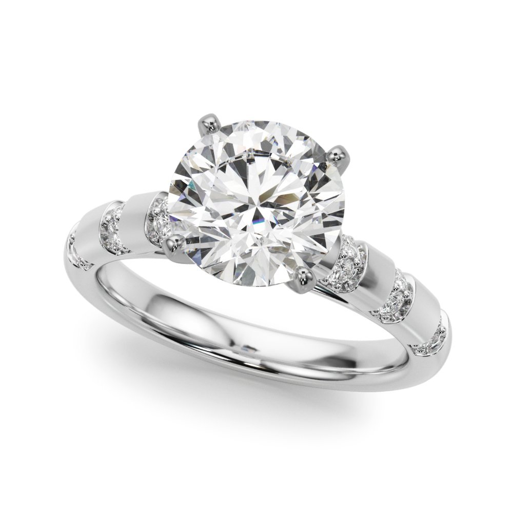 The Lyra setting features a cathedral-style profile with a high-arching shoulder design that securely supports the center stone. The band incorporates spaced round accent diamonds set in individual polished segments for uniform brilliance and structural balance. The prong head is elevated to maximize light return while maintaining stability. An open undergallery allows additional light flow and facilitates easy cleaning. Compatible with most center stone shapes and available in all standard precious metals.