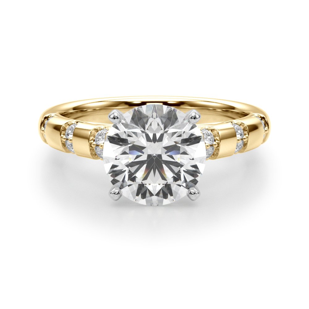 The Lyra setting features a cathedral-style profile with a high-arching shoulder design that securely supports the center stone. The band incorporates spaced round accent diamonds set in individual polished segments for uniform brilliance and structural balance. The prong head is elevated to maximize light return while maintaining stability. An open undergallery allows additional light flow and facilitates easy cleaning. Compatible with most center stone shapes and available in all standard precious metals.