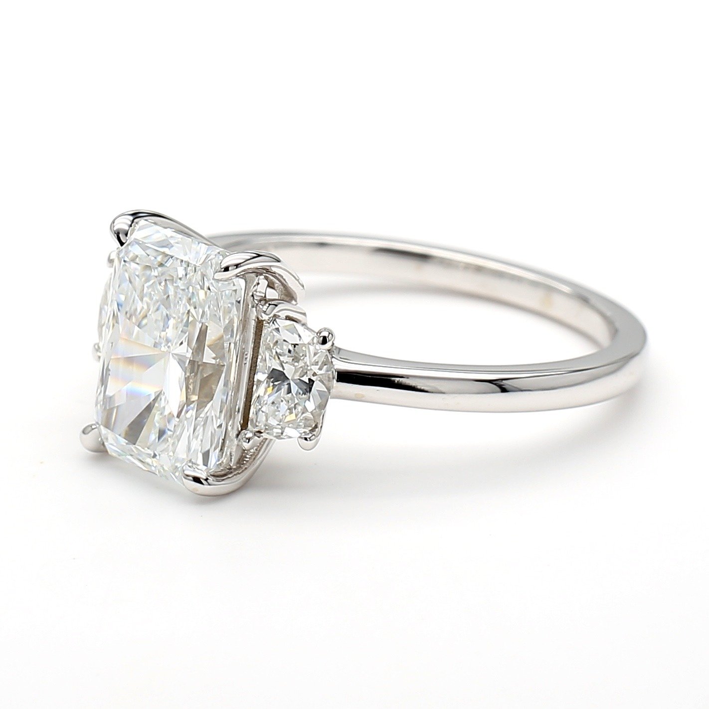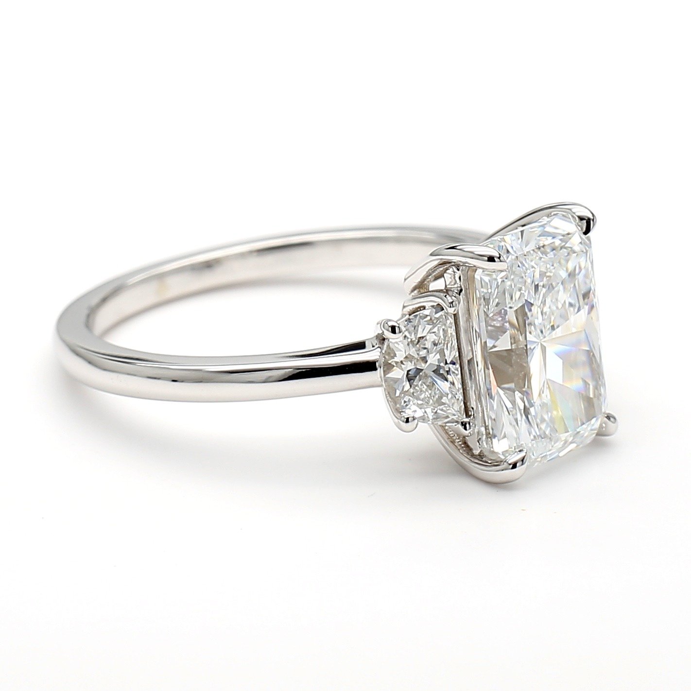 The Madeline Diamond Engagement Ring is a breathtaking three-stone design featuring two perfectly matched half-moon diamonds that elegantly frame the center stone of your choice. The half-moon side stones enhance brilliance and add a touch of sophistication to this timeless setting. Set on a sleek, polished band, this ring exudes both classic elegance and modern appeal. Complete this setting with any shape and metal preference of your choice.