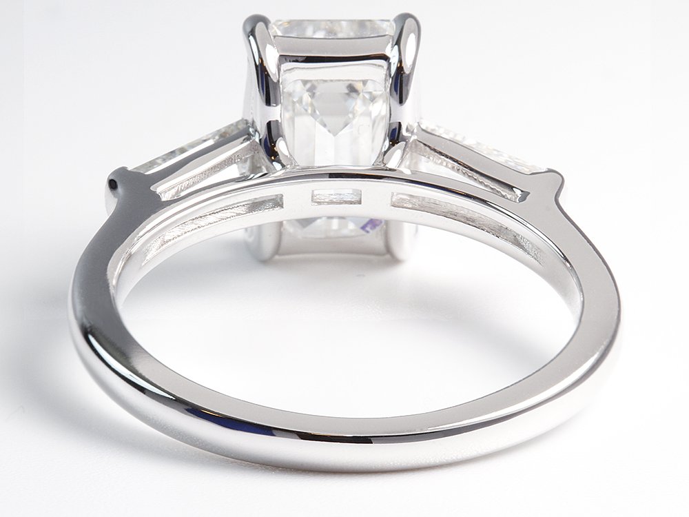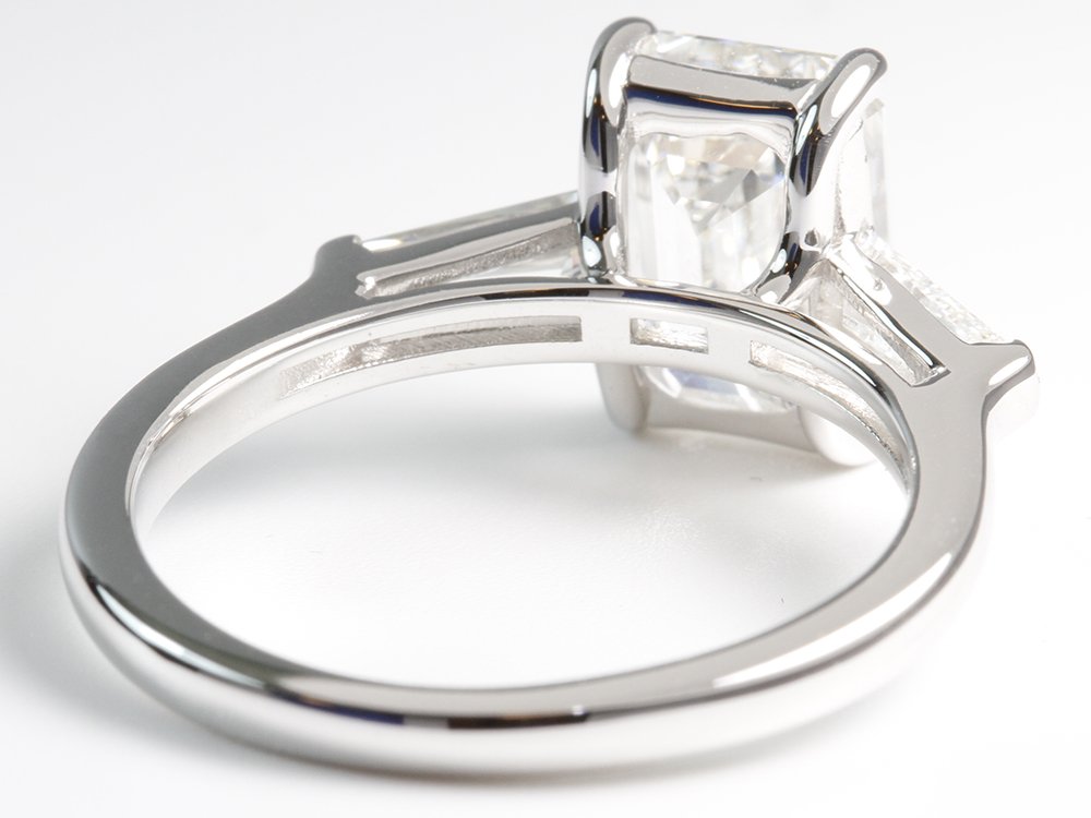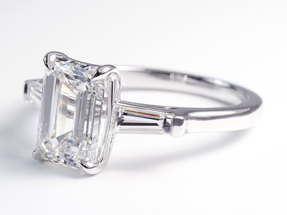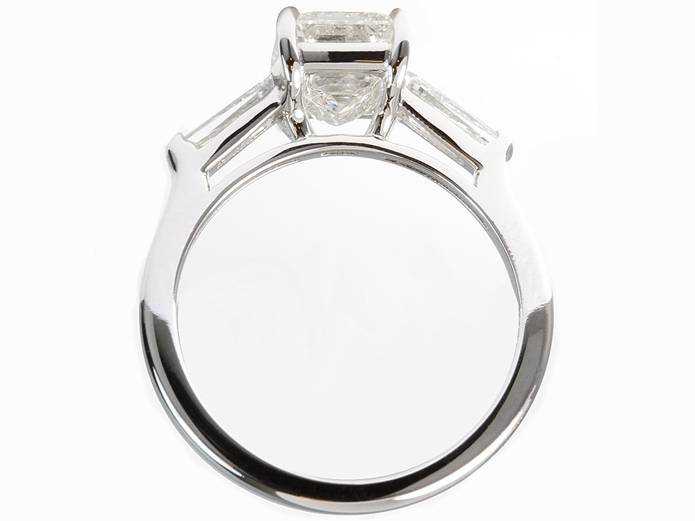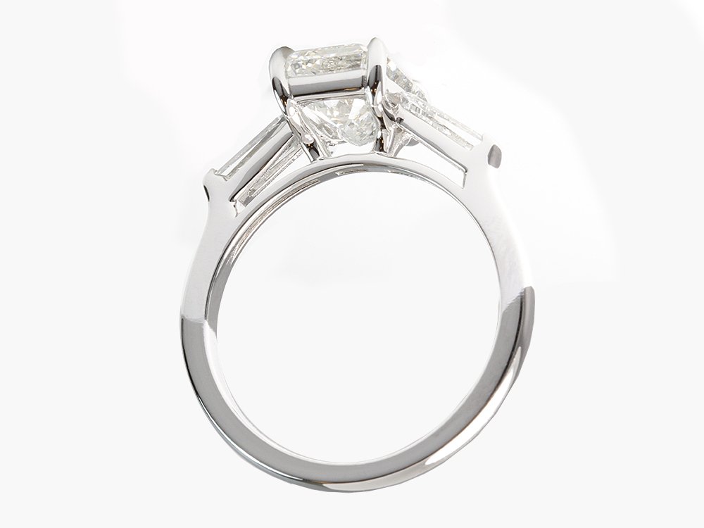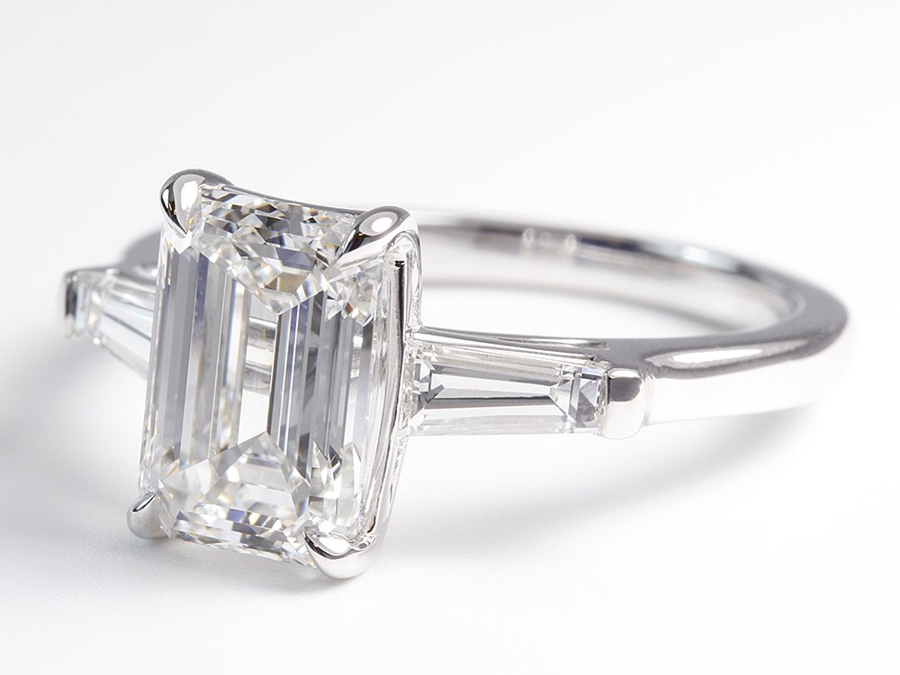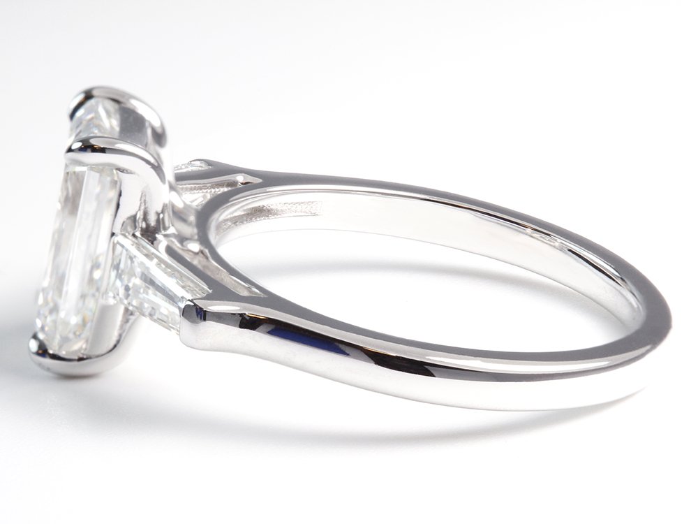 The Malibu diamond engagement ring is a classic setting that features two perfectly matching tapered baguettes adjourning each side of your center diamond. This setting features slightly elongated baguettes to create a sleek and elegant style that compliments elongated shapes, like radiant, emerald, ovals, pear and marquise center diamonds. This setting also works well with other shapes like princess, asscher, cushion and round. Also available in yellow gold. Complete this setting with your choice of main diamond.