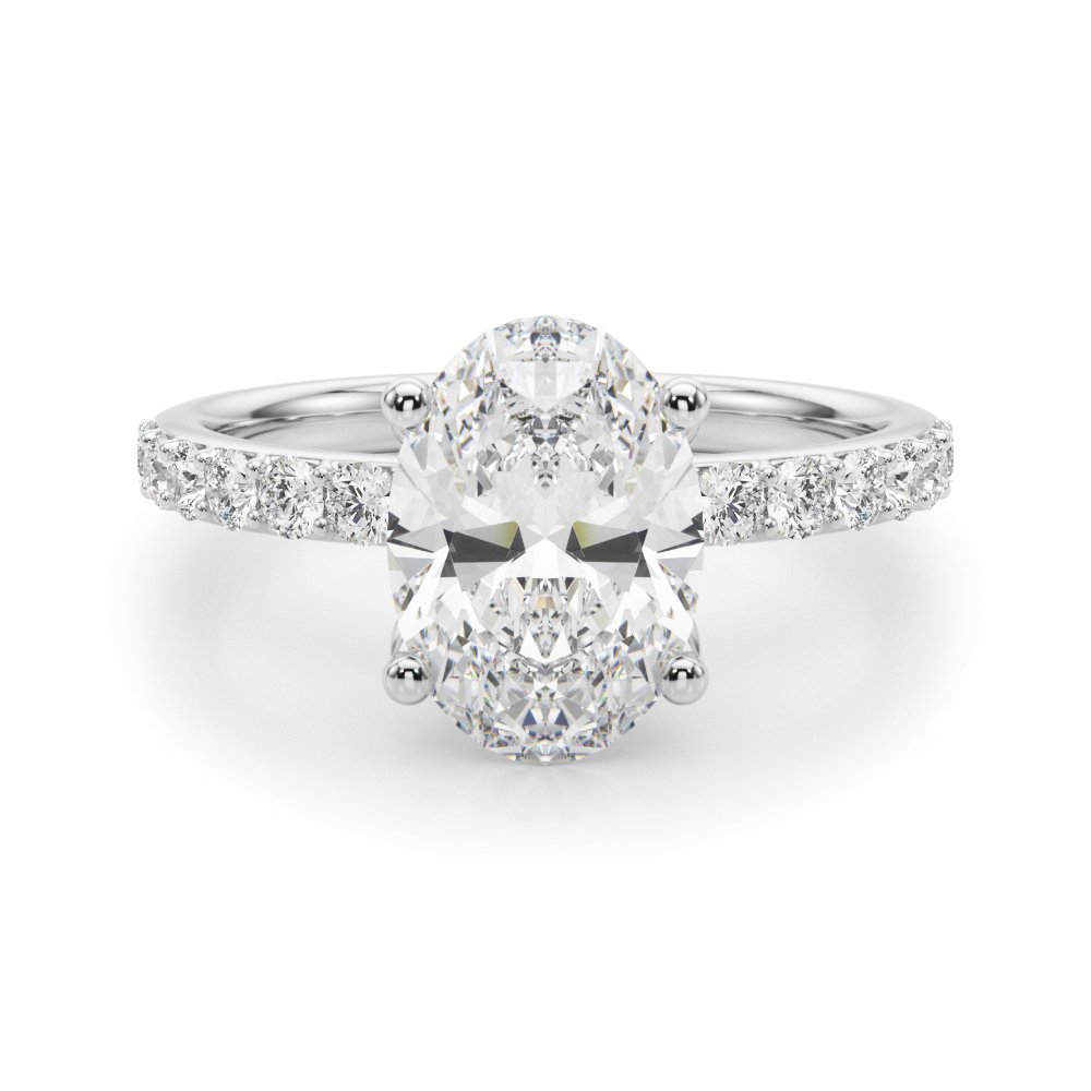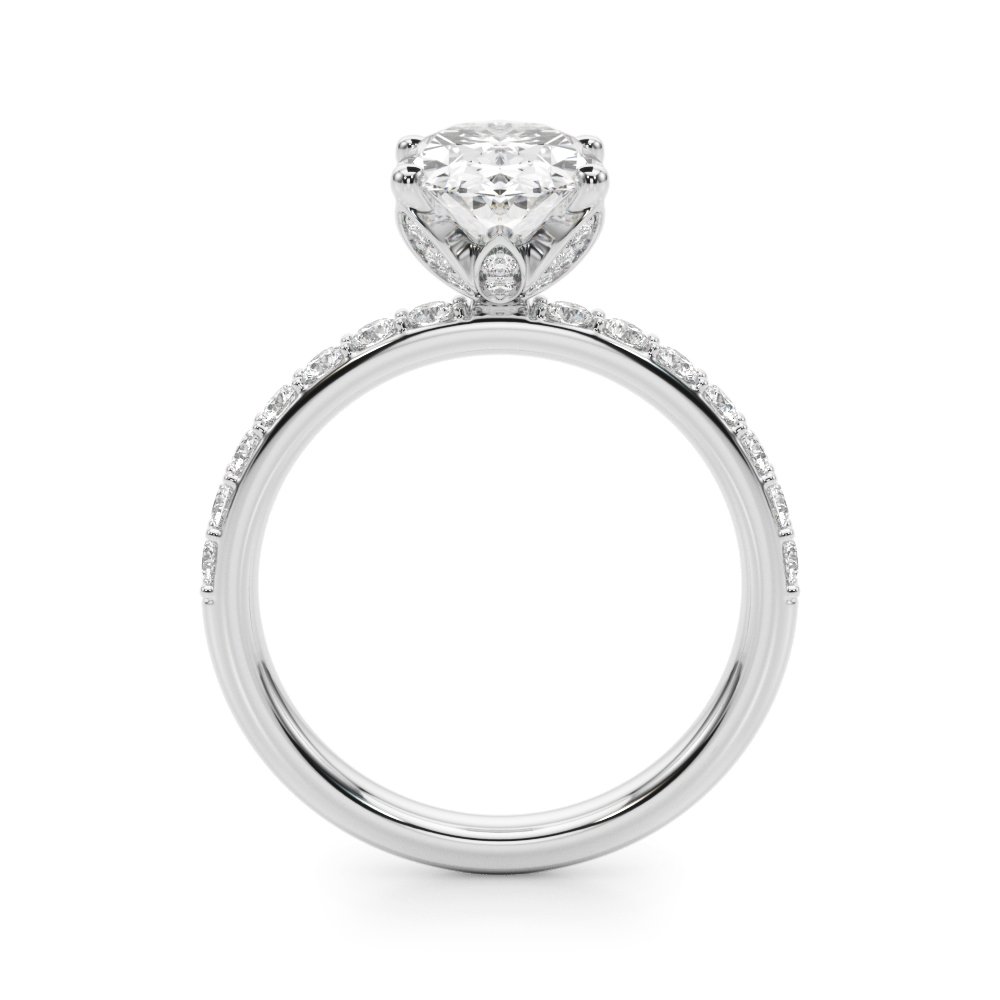 The Mira Diamond Engagement Ring showcases a round brilliant center diamond elevated in a refined four-prong cathedral setting, with a hidden halo and a delicate bezel-set peekaboo diamond accent for added charm. The band features intricately intertwined pavé-set diamonds that shimmer from every angle, gracefully tapering toward the base for comfort. From the side, the ring reveals a romantic and detailed gallery with openwork that allows light to pass through, enhancing the brilliance of the center stone. Crafted in your choice of precious metals, the Mira design beautifully balances elegance, artistry, and modern sophistication