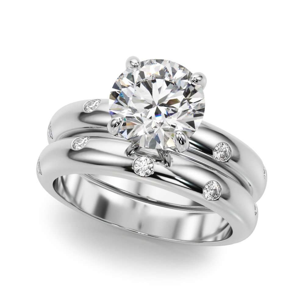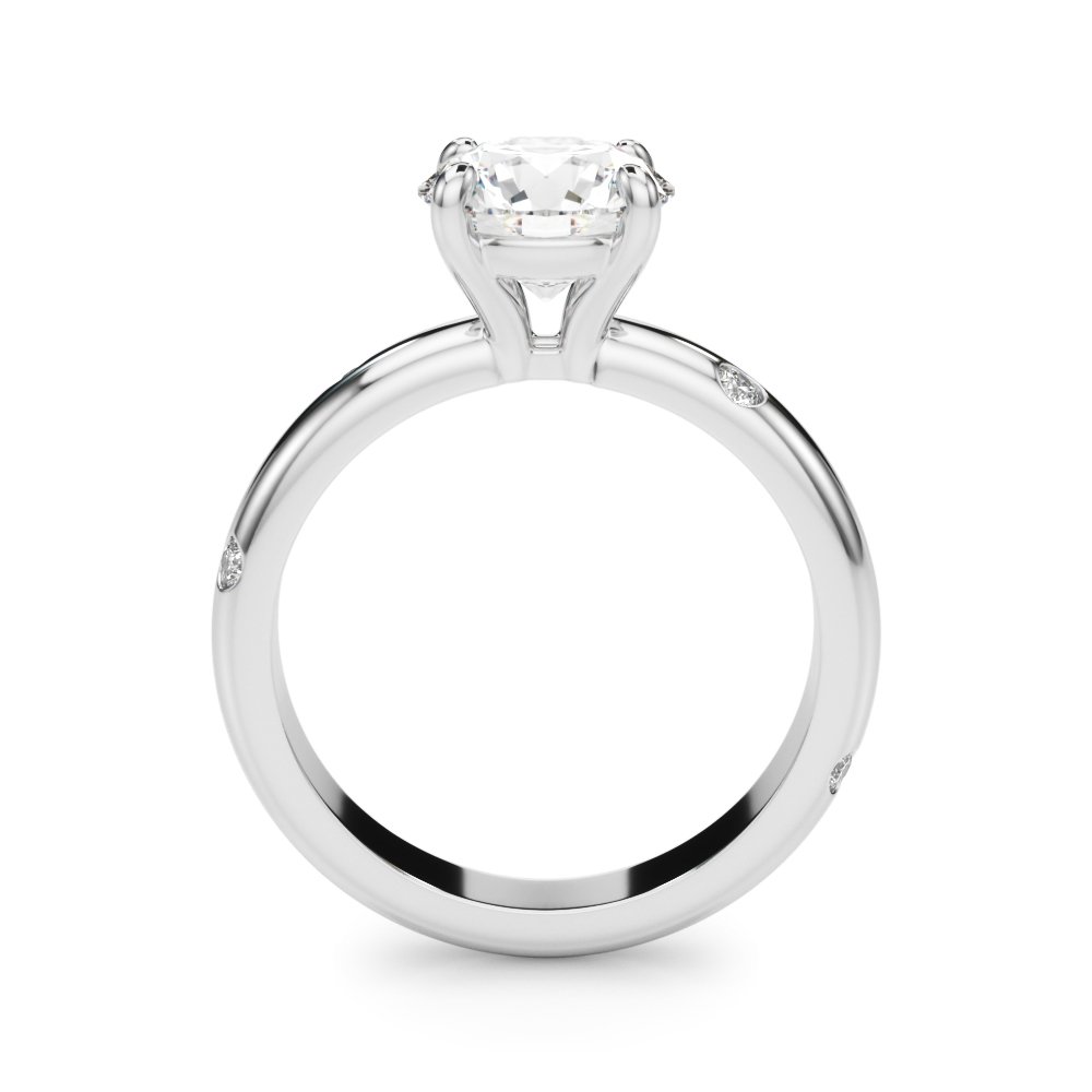 The Noa engagement ring features a classic four-prong setting that holds a round brilliant center diamond with maximum security and light performance. The polished band is accented with evenly spaced bezel-set round diamonds, adding a subtle touch of sparkle and modern elegance. Crafted for comfort and timeless appeal, the Noa design combines minimalism with a refined decorative detail, making it an ideal choice for those who appreciate understated sophistication.