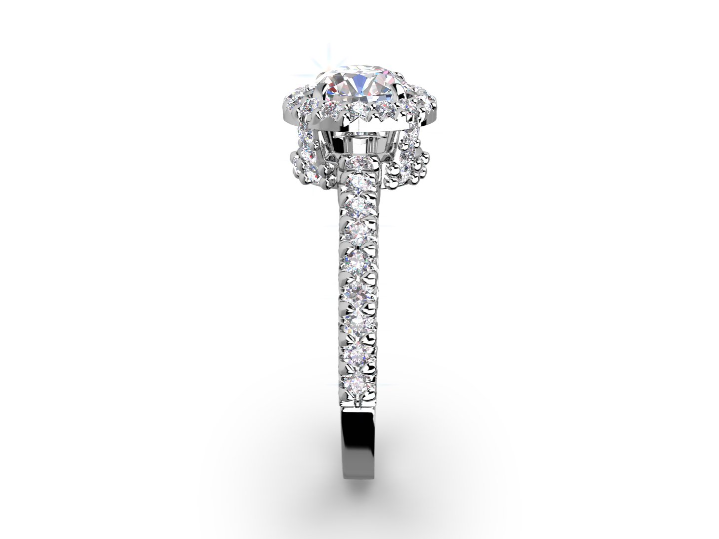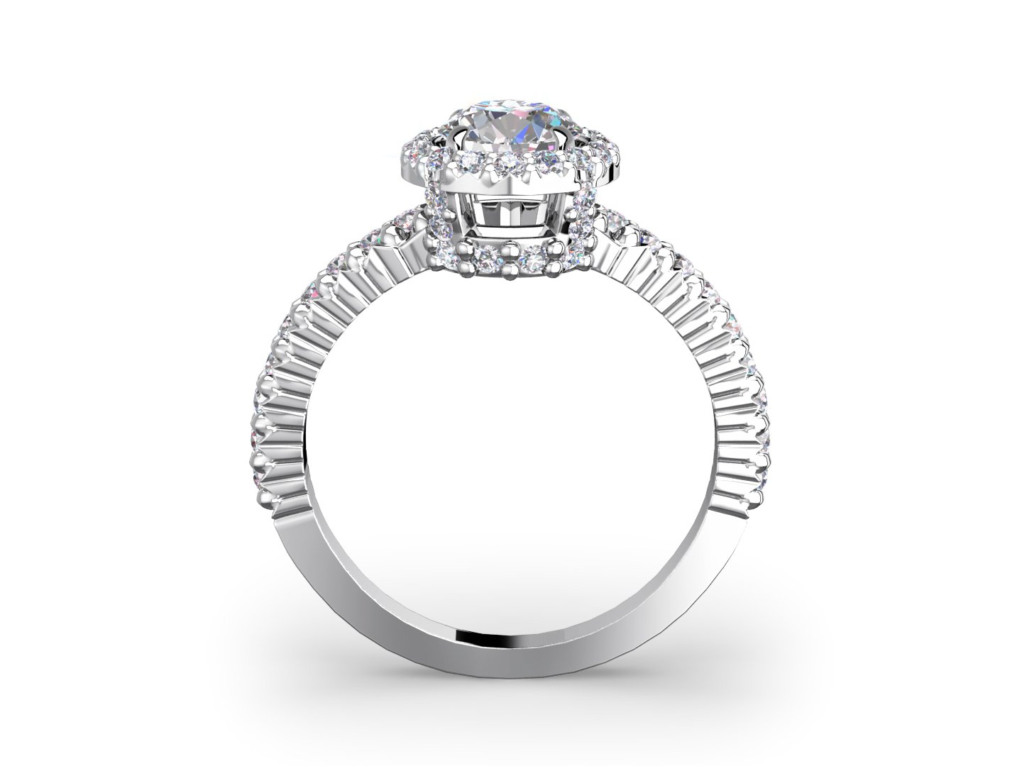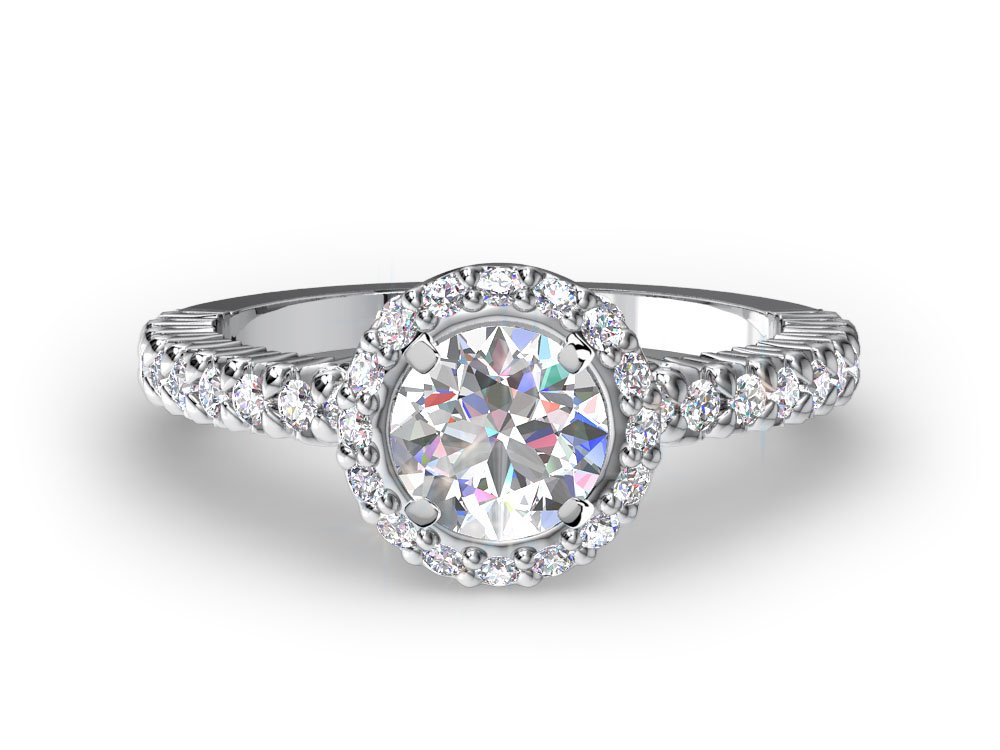 This halo setting features pave-set diamonds up the prongs, on the base of the crown and around your center diamond. The diamonds continue 3/4 way down the band.
