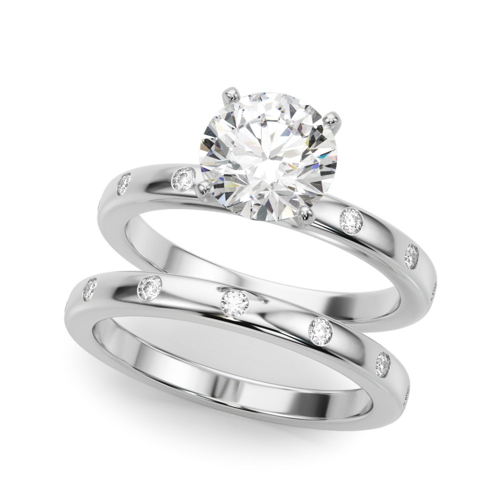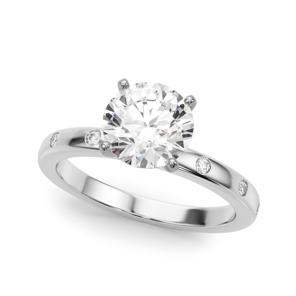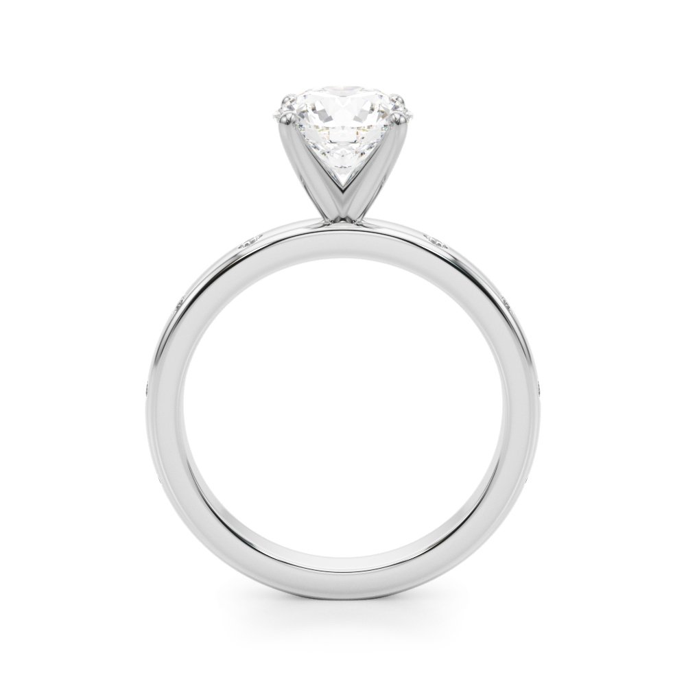 The Pearl Diamond Engagement Ring features a center diamond complemented by small round diamonds set along the band in delicate bezel settings. The bezel-set diamonds add subtle texture and continuous sparkle while maintaining a smooth, refined finish. This design offers a clean and modern look with added detail along the band, enhancing the overall elegance without overwhelming the center stone.