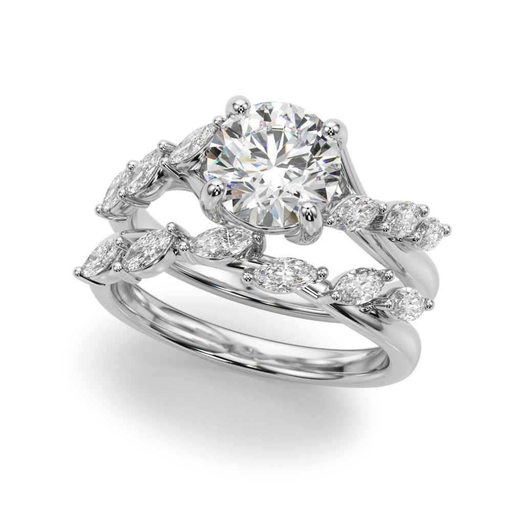 The Piper Diamond Engagement Ring features a central diamond with six marquise-cut side stones set on the band, three on each side. The marquise stones are arranged symmetrically to enhance the overall profile of the ring. Their elongated shape adds subtle detail and additional light reflection along the band, complementing the center stone without overpowering it. The design balances clean lines with geometric accents for a structured, polished look.