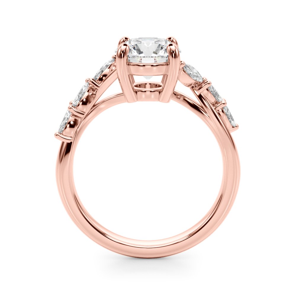 The Piper Diamond Engagement Ring features a central diamond with six marquise-cut side stones set on the band, three on each side. The marquise stones are arranged symmetrically to enhance the overall profile of the ring. Their elongated shape adds subtle detail and additional light reflection along the band, complementing the center stone without overpowering it. The design balances clean lines with geometric accents for a structured, polished look.