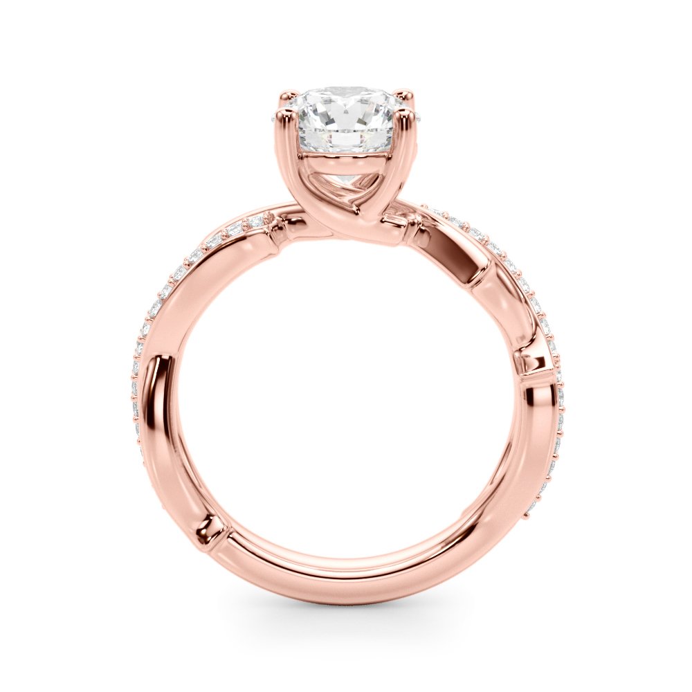 The Renee Diamond Engagement Ring features a round brilliant-cut center diamond secured by four prongs, set on an intertwined band design. One strand of the band is polished metal, while the other is adorned with pavé-set round diamonds, creating a twisted split-shank structure that joins at the base.