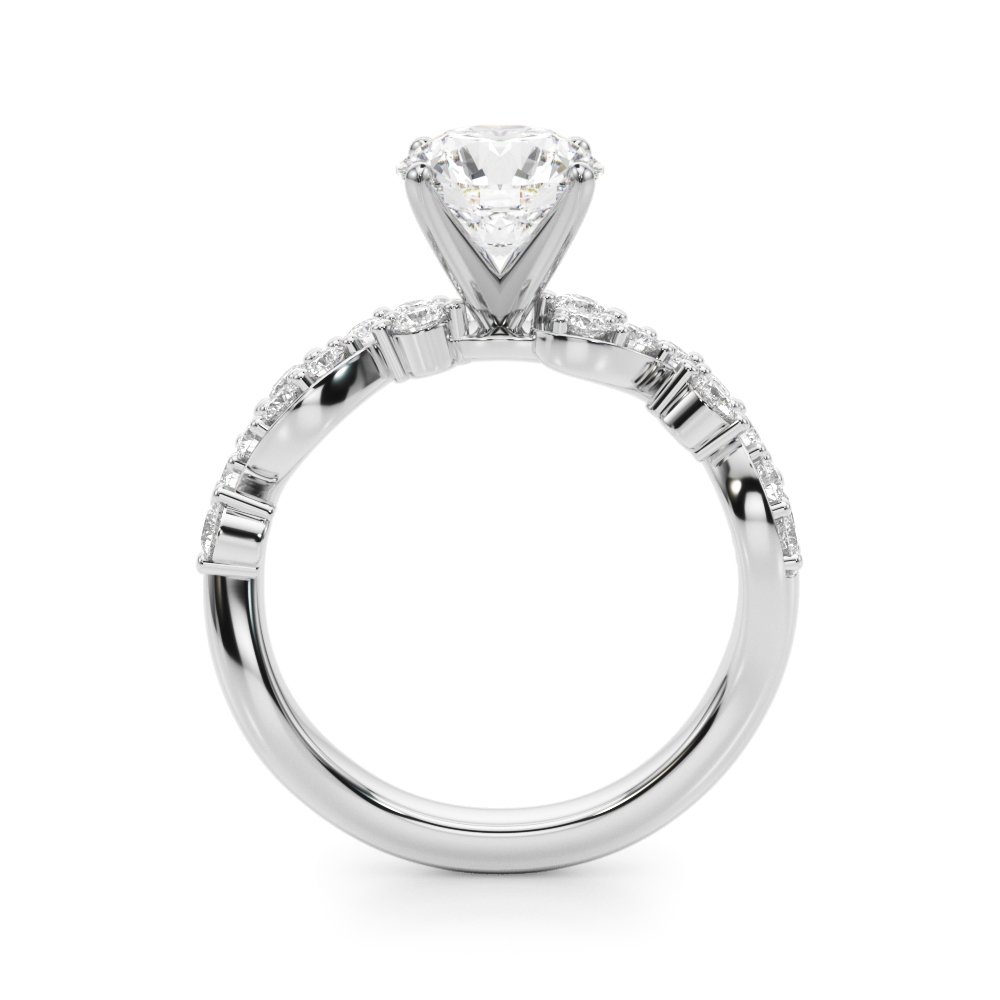 The Rio Diamond Engagement Ring features a round center diamond set on a curved, pavé-set diamond band. The band’s gentle wave shape creates a sense of movement, while the closely set round diamonds add continuous brilliance across the surface. The design highlights symmetry with a soft, sculptural flow, offering a modern interpretation of a classic diamond band. Clean lines and precise detailing give the ring a balanced and polished look.