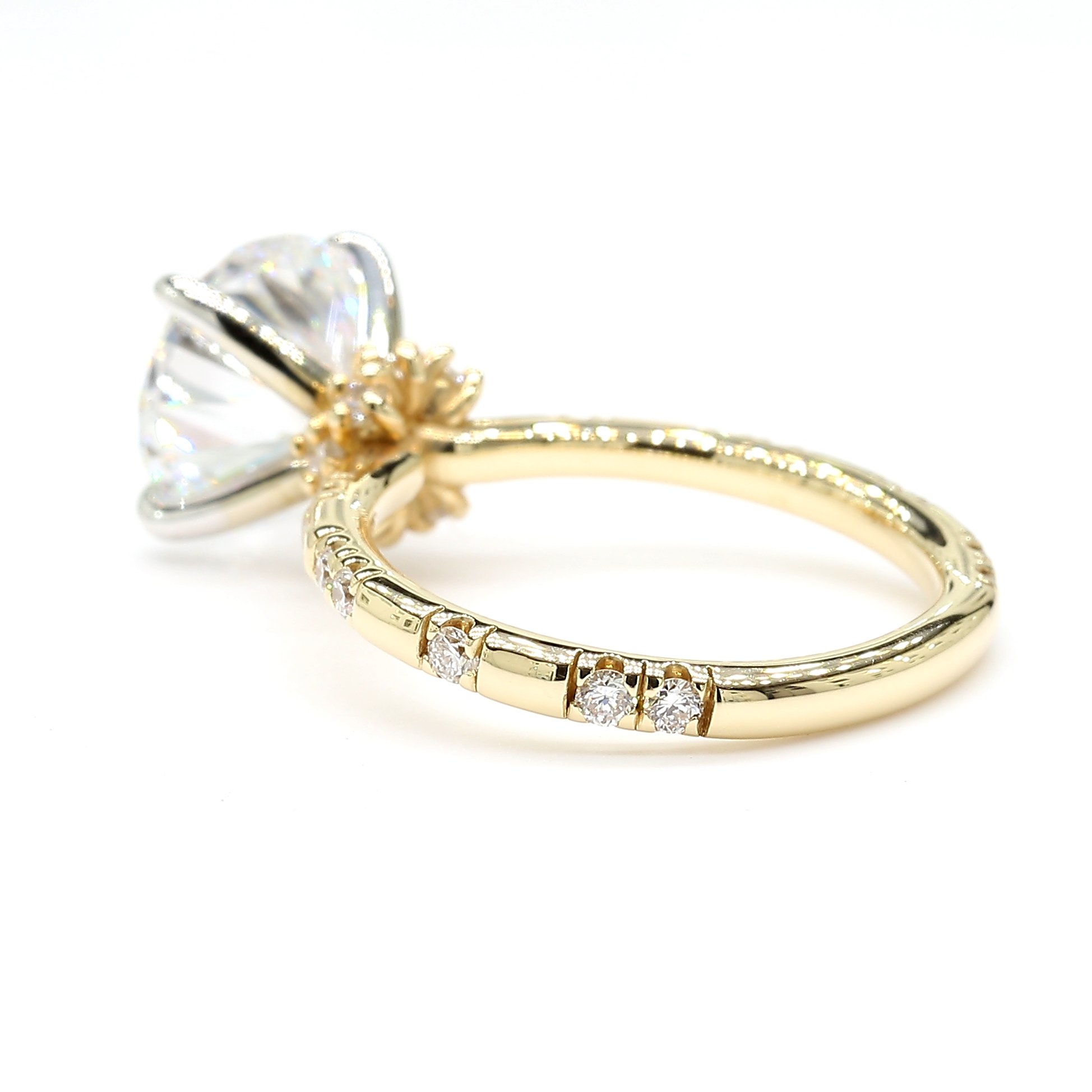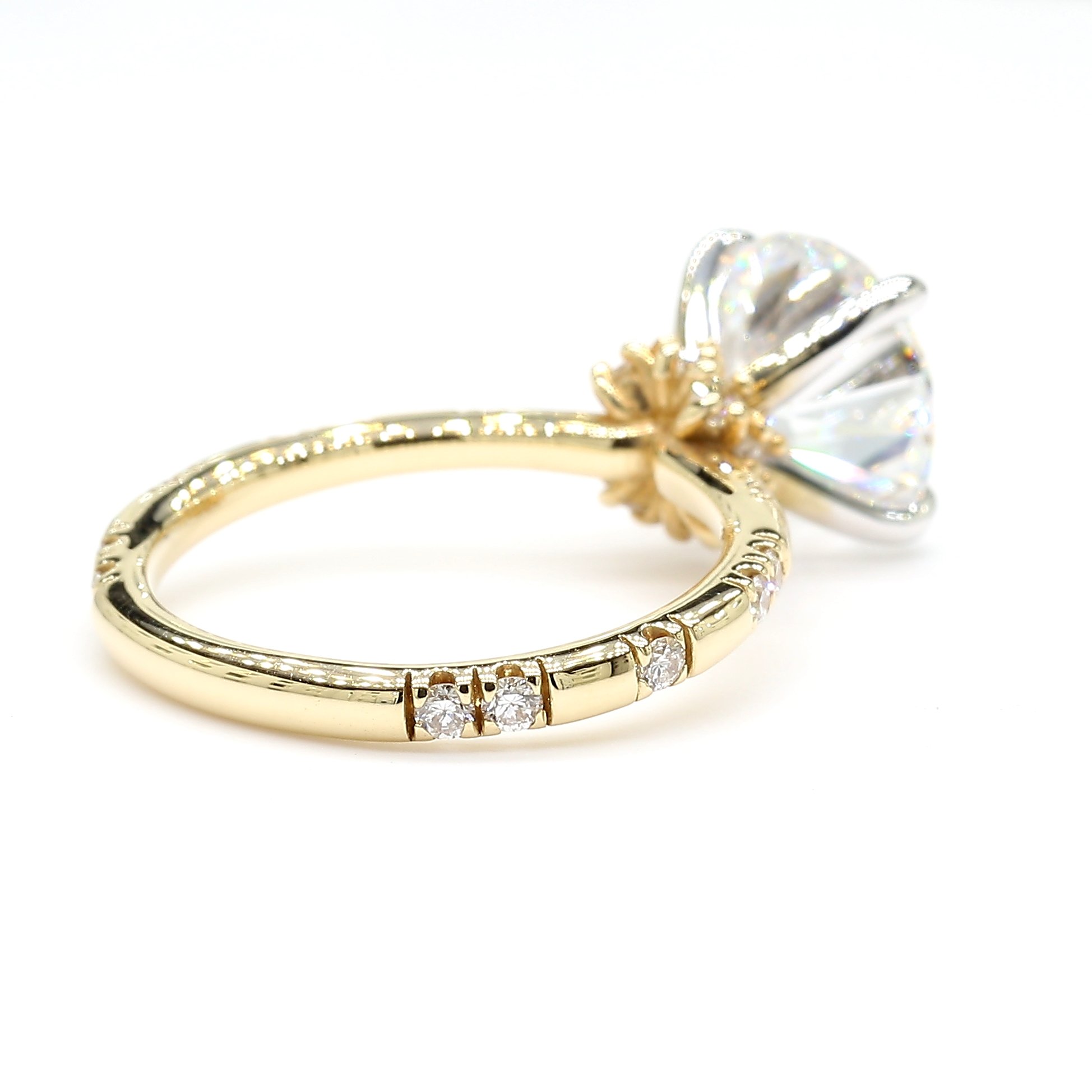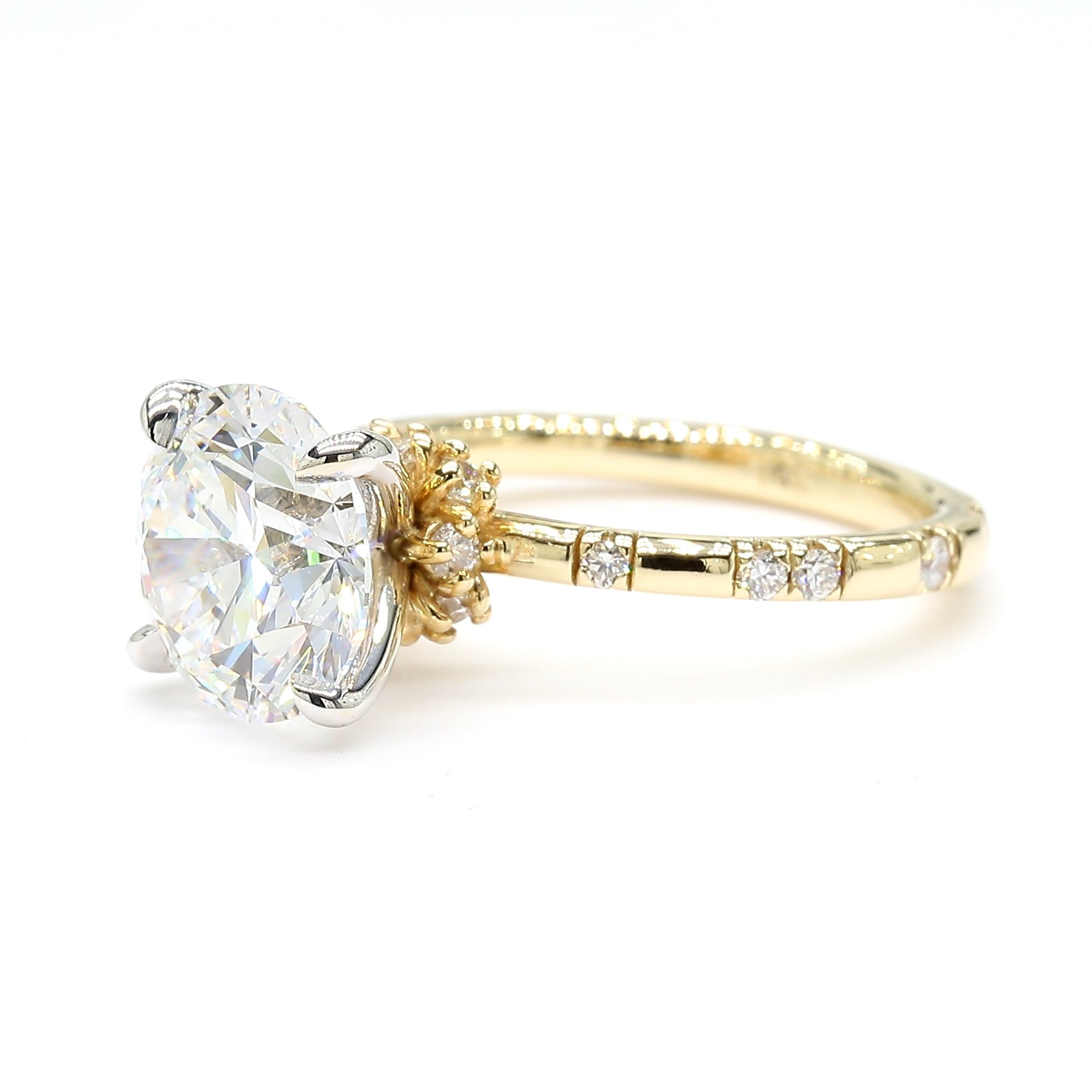 A breathtaking combination of classic and vintage charm, the Sienna diamond engagement ring features a brilliant center diamond held in an ornate floral basket setting. The band, adorned with sparkling diamonds, enhances its timeless beauty, while the delicate details on the gallery add a romantic touch. This ring is perfect for those who seek elegance with a hint of vintage inspiration.