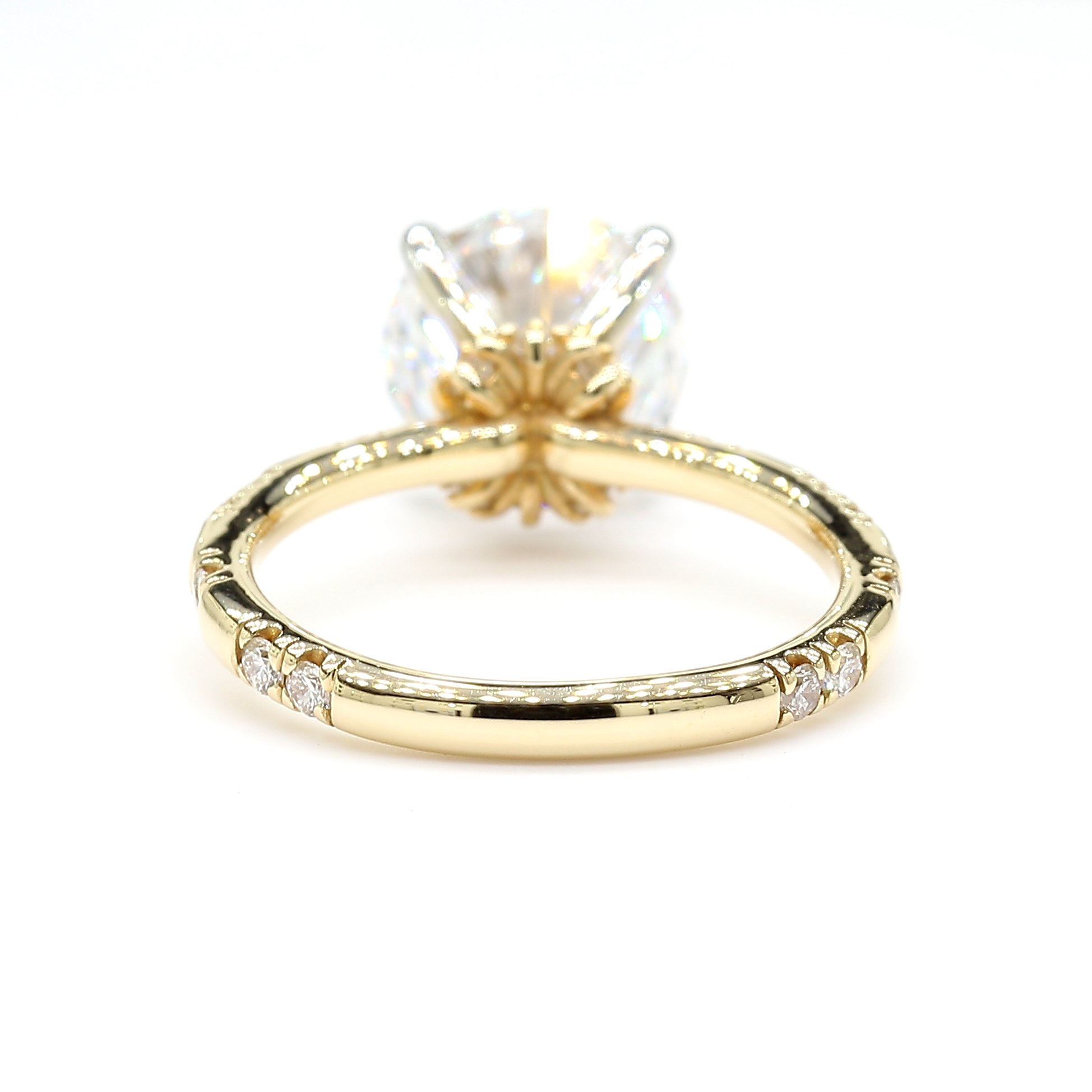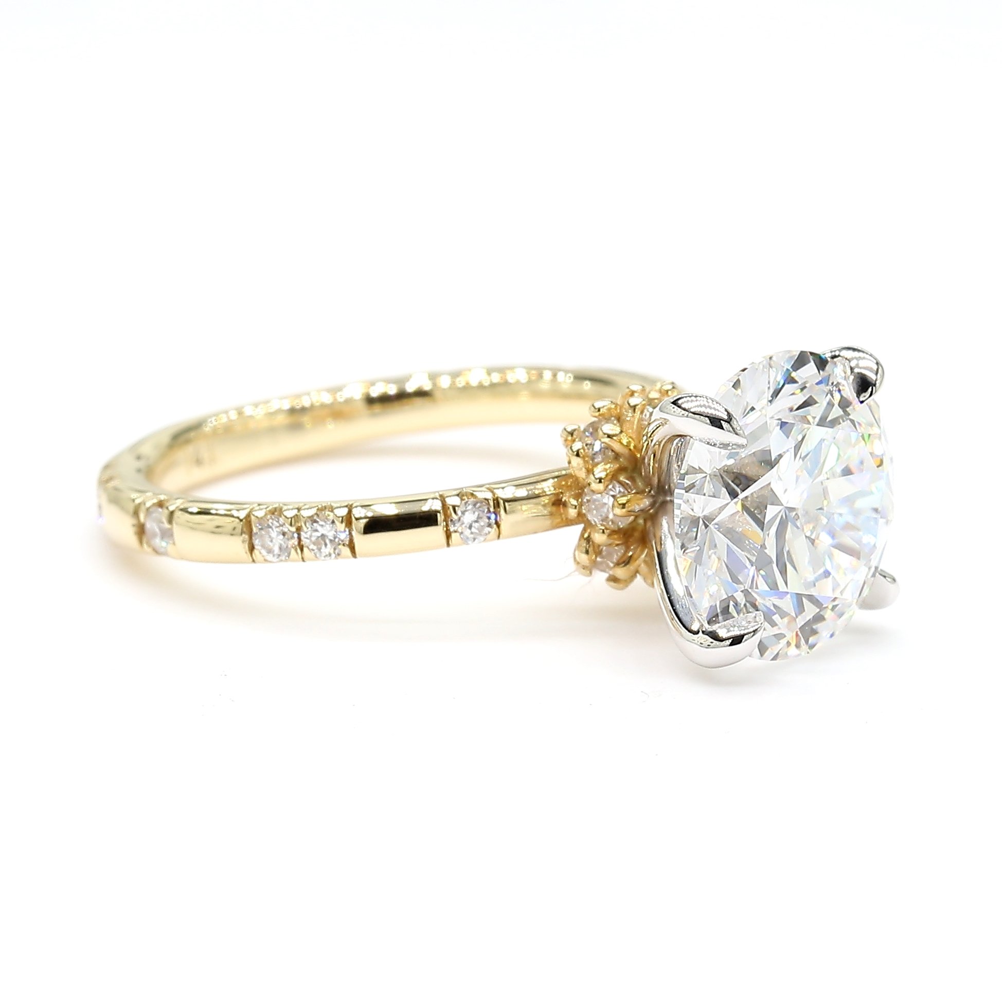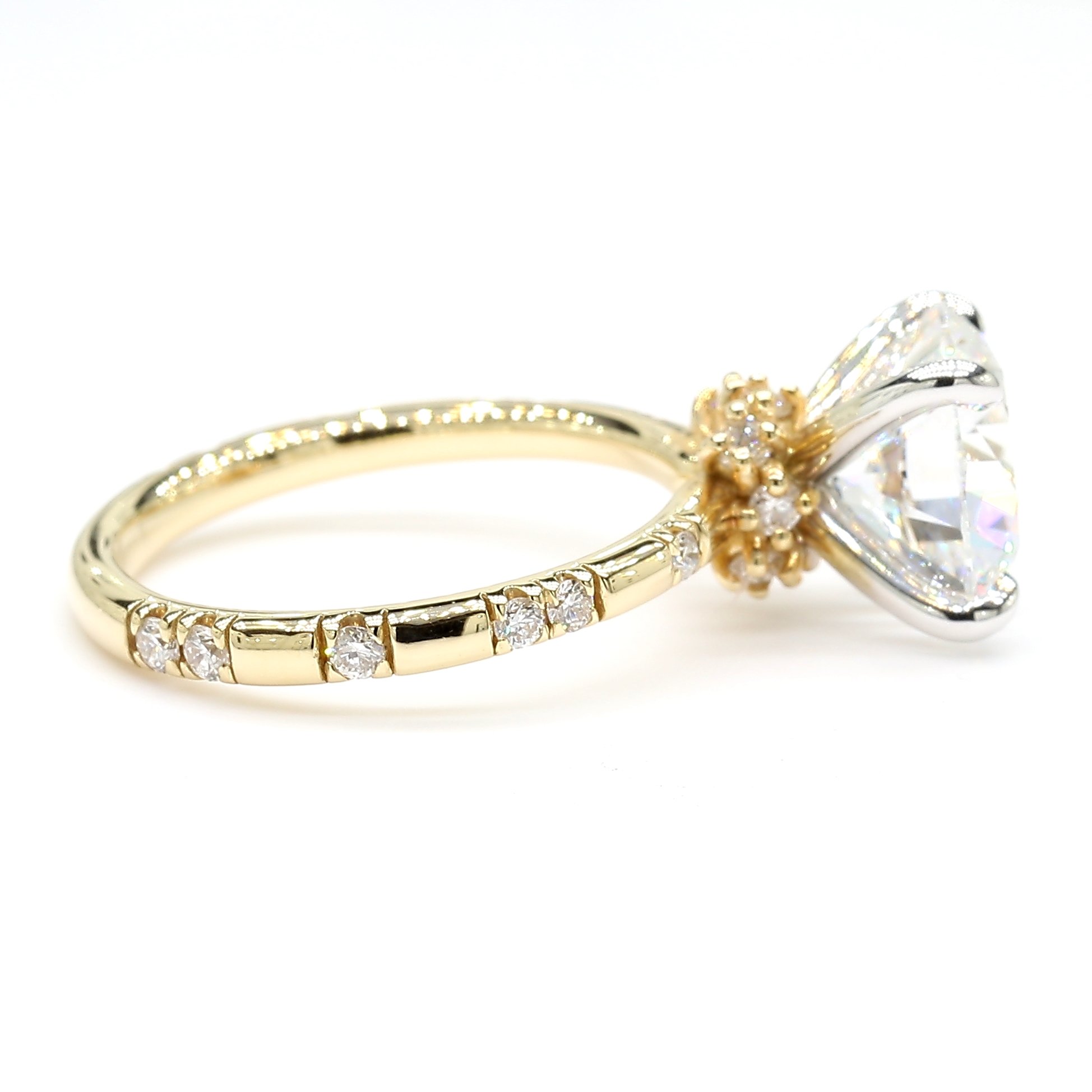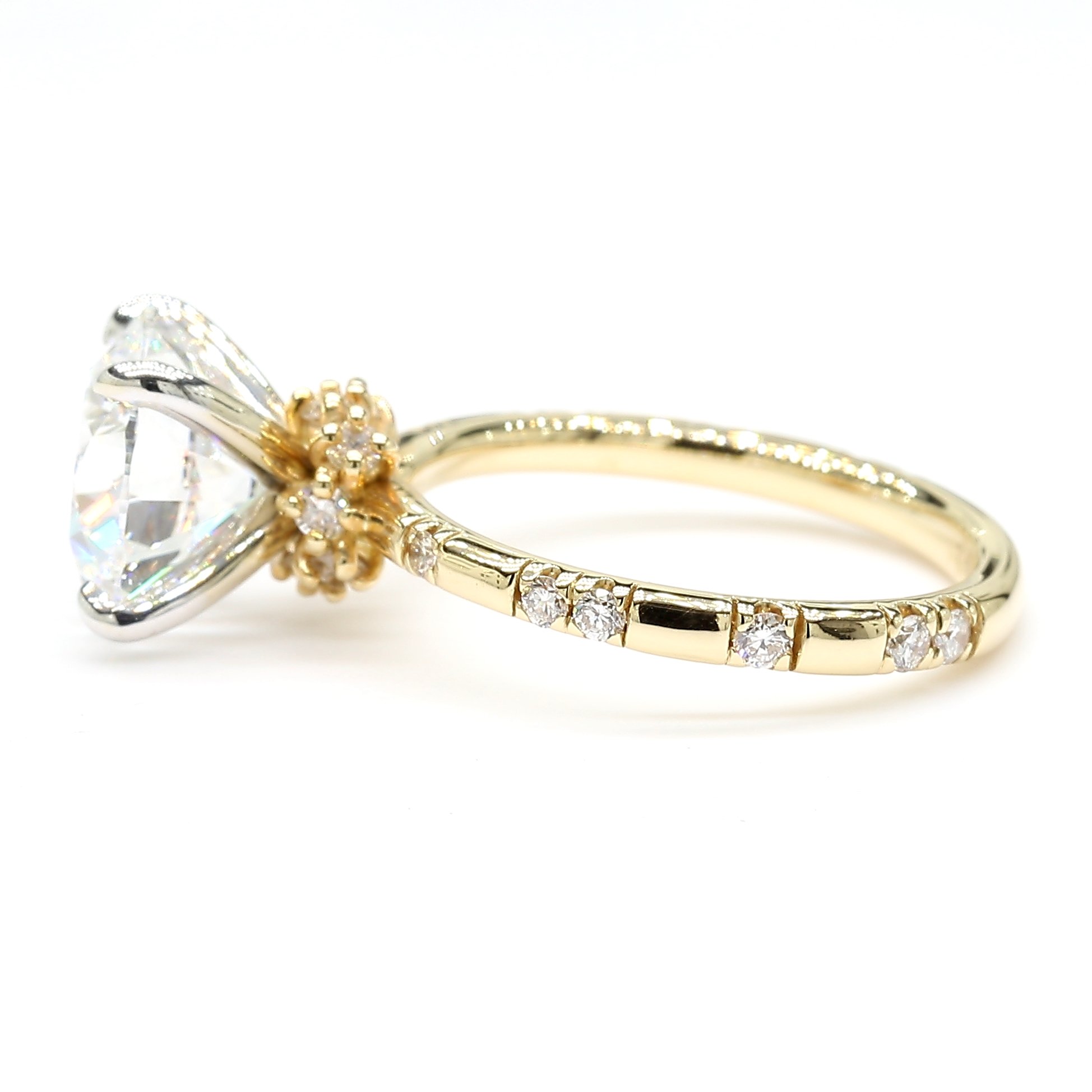 A breathtaking combination of classic and vintage charm, the Sienna diamond engagement ring features a brilliant center diamond held in an ornate floral basket setting. The band, adorned with sparkling diamonds, enhances its timeless beauty, while the delicate details on the gallery add a romantic touch. This ring is perfect for those who seek elegance with a hint of vintage inspiration.