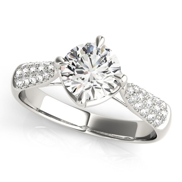 The Skye setting features a split shank design with three rows of pavé-set diamonds on each side, offering balanced brilliance and structural integrity. The center stone is secured by four claw-style prongs in a distinctive triangular formation, maximizing light entry while ensuring durability. The tapered shoulders enhance finger coverage without adding bulk, maintaining a low-profile comfort fit. Compatible with most diamond shapes and available in platinum, white gold, yellow gold, and rose gold.