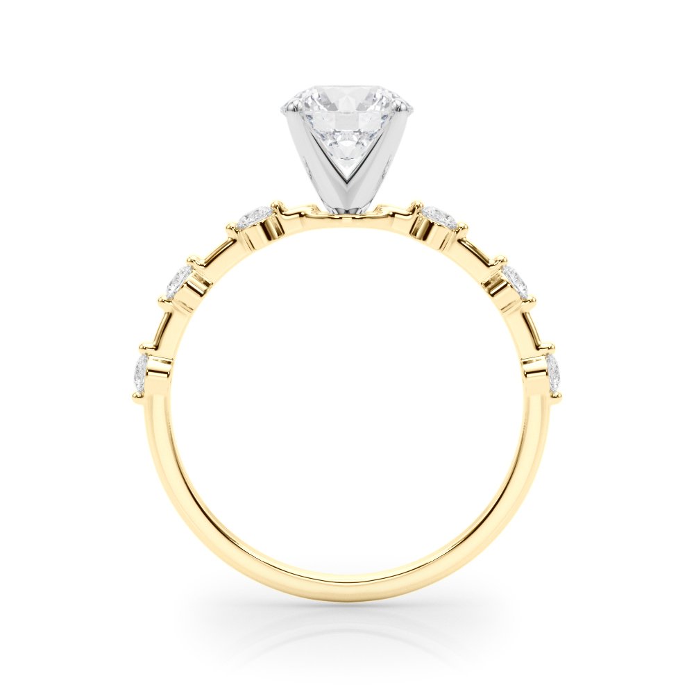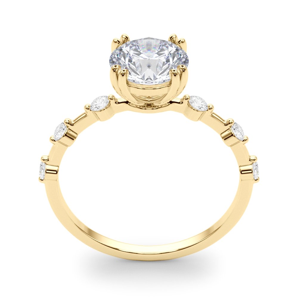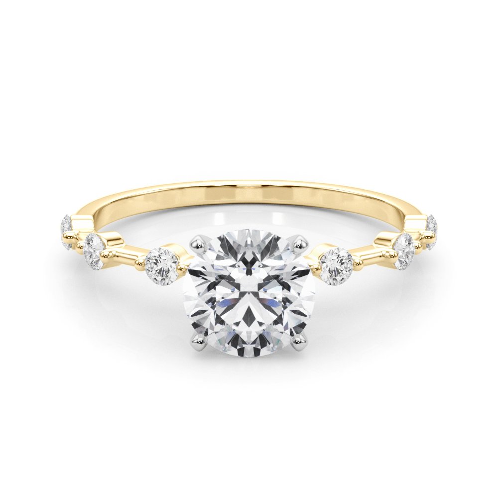 The Sofia Engagement Ring is a chic and modern design that pairs timeless elegance with contemporary detail. A brilliant round center diamond is secured in a classic four-prong setting, elevated to capture light from every angle. Along the band, bezel-inspired prongs hold a series of round accent diamonds in an open, airy arrangement that creates a delicate yet striking look. The alternating diamonds give the ring a rhythmic sparkle, while the slim, polished band keeps the focus on the artistry of the stones. Perfect for those who appreciate a fresh twist on tradition, the Sofia offers a refined balance of brilliance and sophistication.
