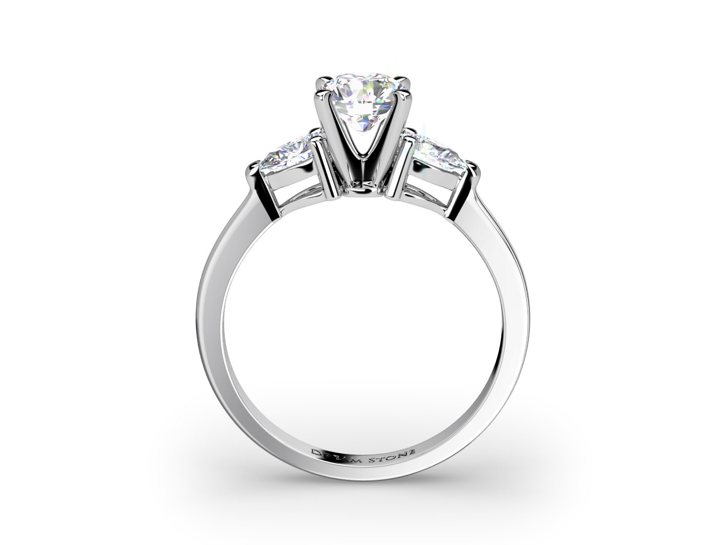 Two perfectly matching beautiful pear shape diamonds create a romantic and dramatic outline for this setting. Complete this ring with your choice of center diamond. (DreamStone logo is not engraved on inside of the band).