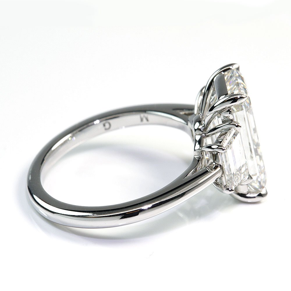 This classic three-stone ring features two perfectly matching trapazoids to accent your center diamond. A smooth edge in the band tapers slightly towards the middle.