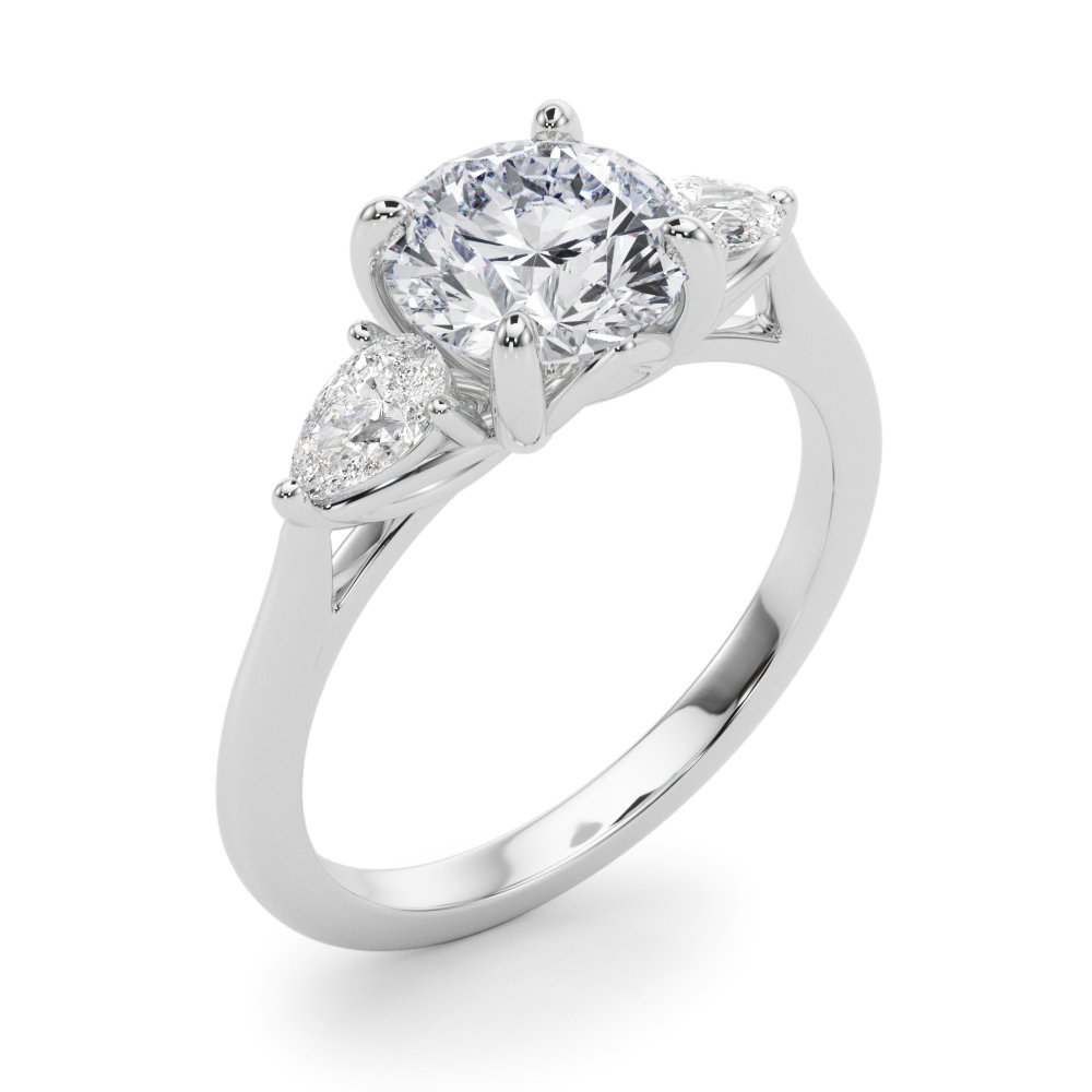 The Zaria Diamond Engagement Ring is a graceful three-stone design distinguished by its romantic floral-inspired gallery. A round brilliant center diamond is framed by two pear-shaped side stones, creating a timeless, balanced silhouette. The intricate openwork beneath the setting features petal-like motifs that evoke a blooming flower, offering beauty from every angle. With a clean, polished band and delicate detailing, the Zaria ring is perfect for those who seek elegance, symbolism, and enduring charm in one breathtaking piece.