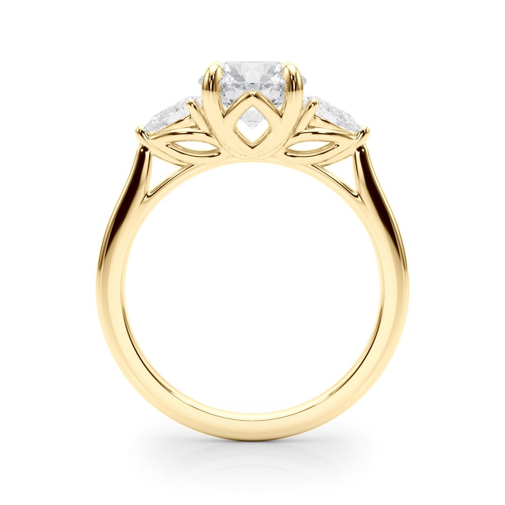 The Zaria Diamond Engagement Ring is a graceful three-stone design distinguished by its romantic floral-inspired gallery. A round brilliant center diamond is framed by two pear-shaped side stones, creating a timeless, balanced silhouette. The intricate openwork beneath the setting features petal-like motifs that evoke a blooming flower, offering beauty from every angle. With a clean, polished band and delicate detailing, the Zaria ring is perfect for those who seek elegance, symbolism, and enduring charm in one breathtaking piece.