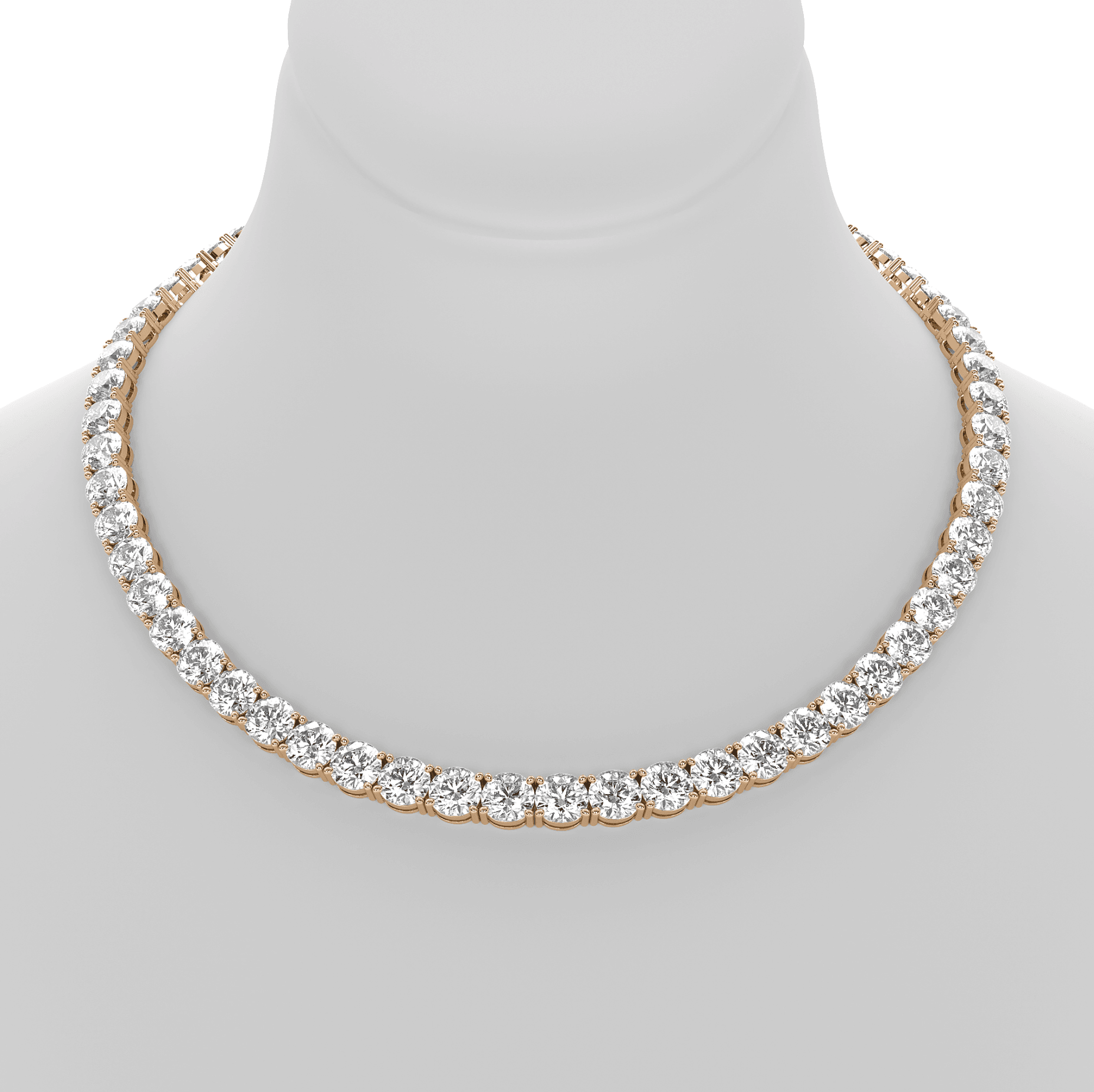 This classic tennis necklace features a continuous line of meticulously matched round brilliant-cut diamonds, each secured in a timeless four-prong setting that maximizes light exposure and enhances brilliance. Crafted in high-polish 14K or 18K gold or platinum, the four-prong design offers both security and a refined, elegant profile. The diamonds are hand-selected for exceptional sparkle and uniformity, creating a seamless and radiant flow around the neckline. Ideal for both everyday luxury and formal occasions, this necklace is a sophisticated staple in any fine jewelry collection.