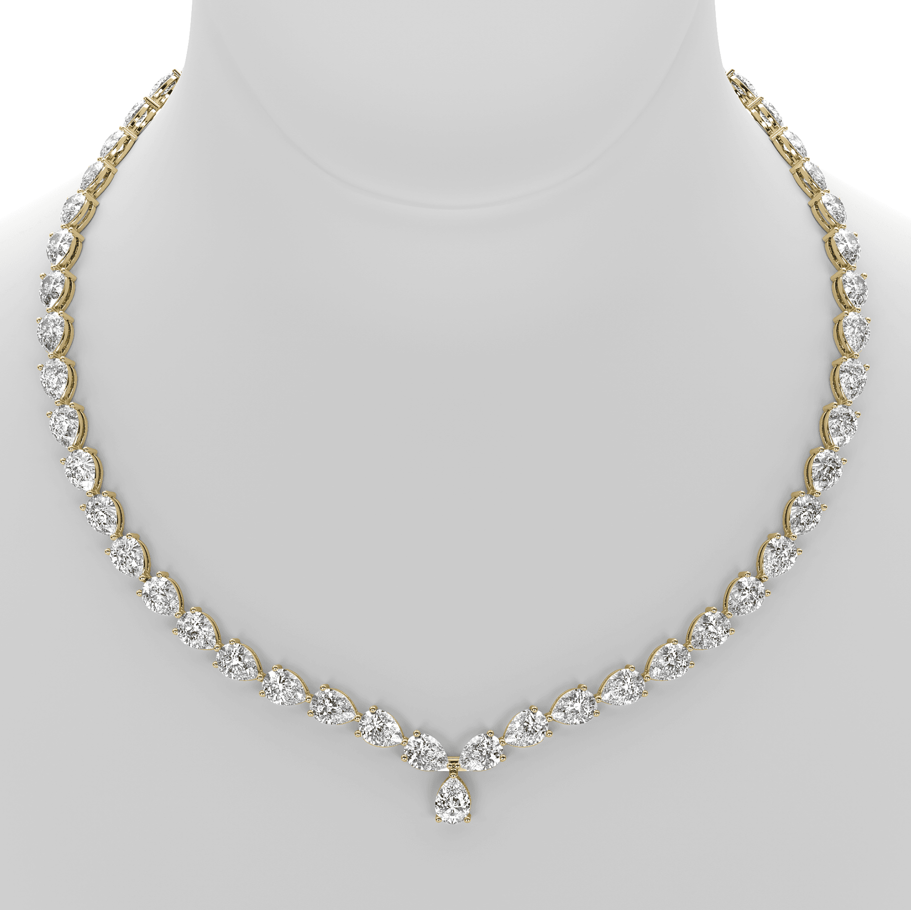 This 3-Prong Pear East to West necklace features a continuous line of meticulously matched Pear brilliant-cut diamonds, each secured in a timeless Three-prong setting that maximizes light exposure and enhances brilliance. Crafted in high-polish 14K or 18K gold or platinum, the Three-prong design offers both security and a refined, elegant profile. The diamonds are hand-selected for exceptional sparkle and uniformity, creating a seamless and radiant flow around the neckline. Ideal for both everyday luxury and formal occasions, this necklace is a sophisticated staple in any fine jewelry collection.