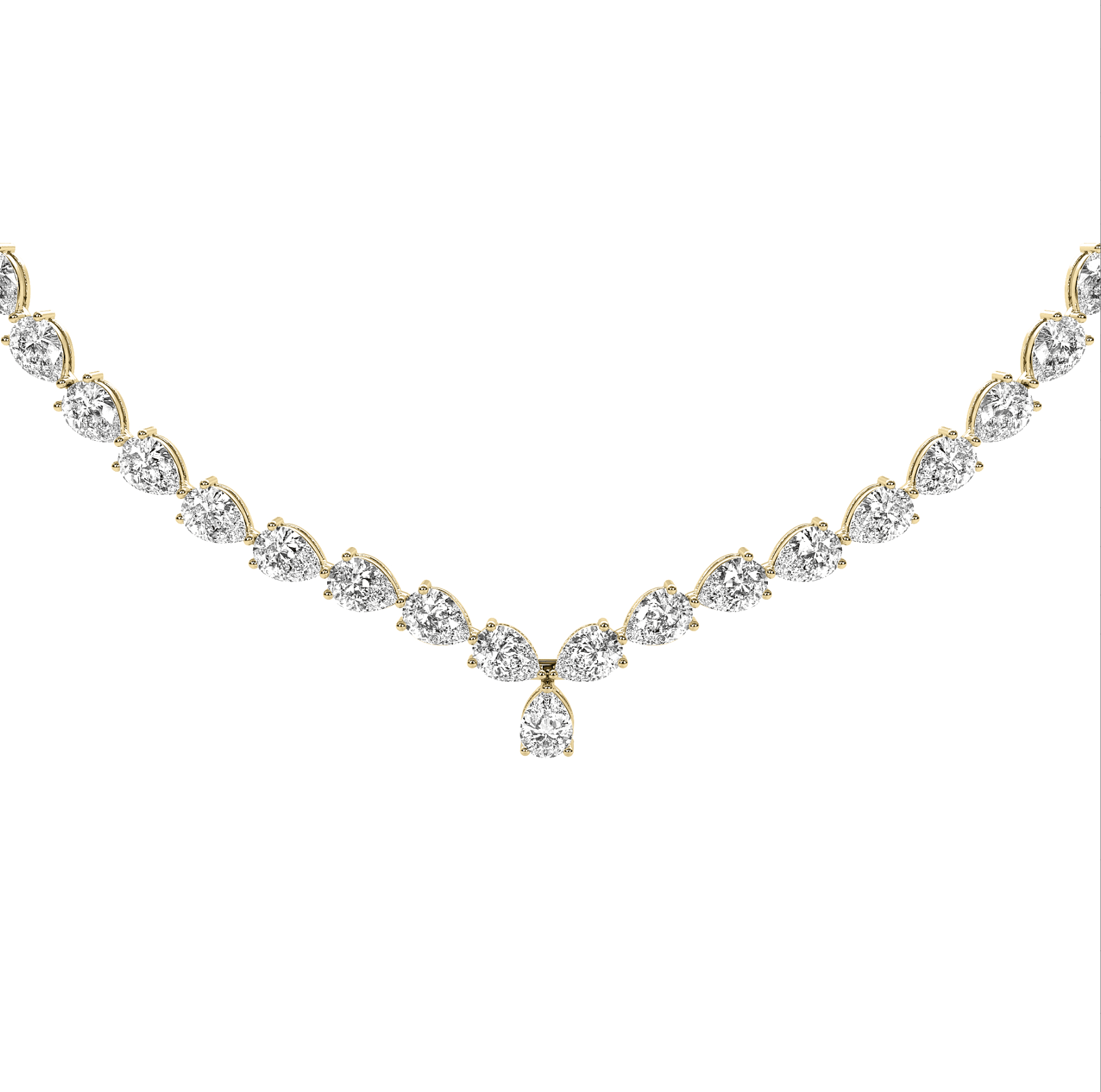 This 3-Prong Pear East to West necklace features a continuous line of meticulously matched Pear brilliant-cut diamonds, each secured in a timeless Three-prong setting that maximizes light exposure and enhances brilliance. Crafted in high-polish 14K or 18K gold or platinum, the Three-prong design offers both security and a refined, elegant profile. The diamonds are hand-selected for exceptional sparkle and uniformity, creating a seamless and radiant flow around the neckline. Ideal for both everyday luxury and formal occasions, this necklace is a sophisticated staple in any fine jewelry collection.