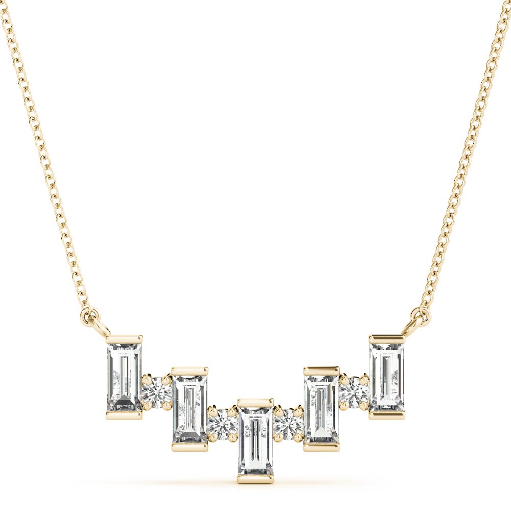 Elevate your style with our exquisite Diamond Bar Pendant, featuring stunning emerald-cut diamonds in a sleek V-shape design, accented by dazzling round diamonds. A symbol of elegance and sophistication. This Bar Pendant is suspended by 18 inch cable chain. Available in white gold, rose gold, or platinum. Choose your diamond type and metal preference.