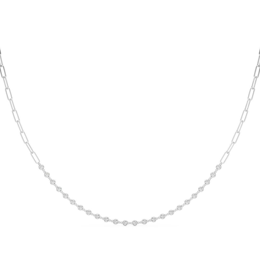 Introducing our Paper Clip Diamond by the Yard Necklace. This modern necklace features sparkling diamonds set in delicate bezels along a stylish paper clip chain, blending contemporary design with timeless elegance. Elevate your style with this exquisite accessory, perfect for adding a touch of sophisticated glamour to any ensemble. Available in white gold, rose gold, or platinum. Choose your diamond type and metal preference.