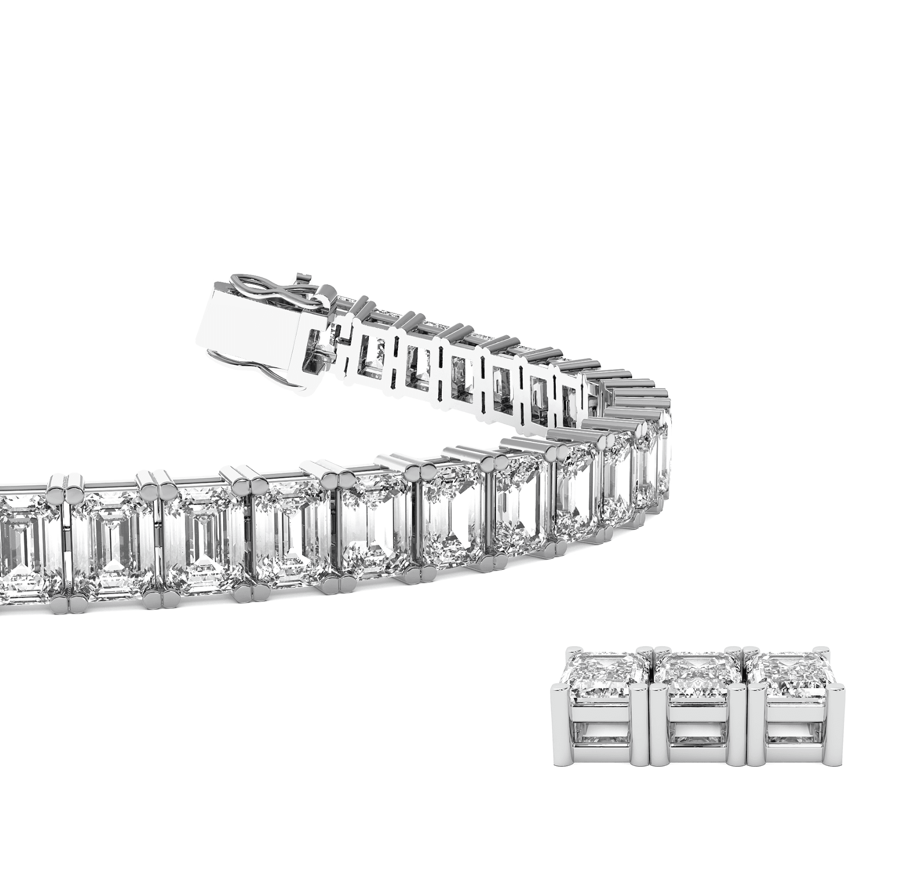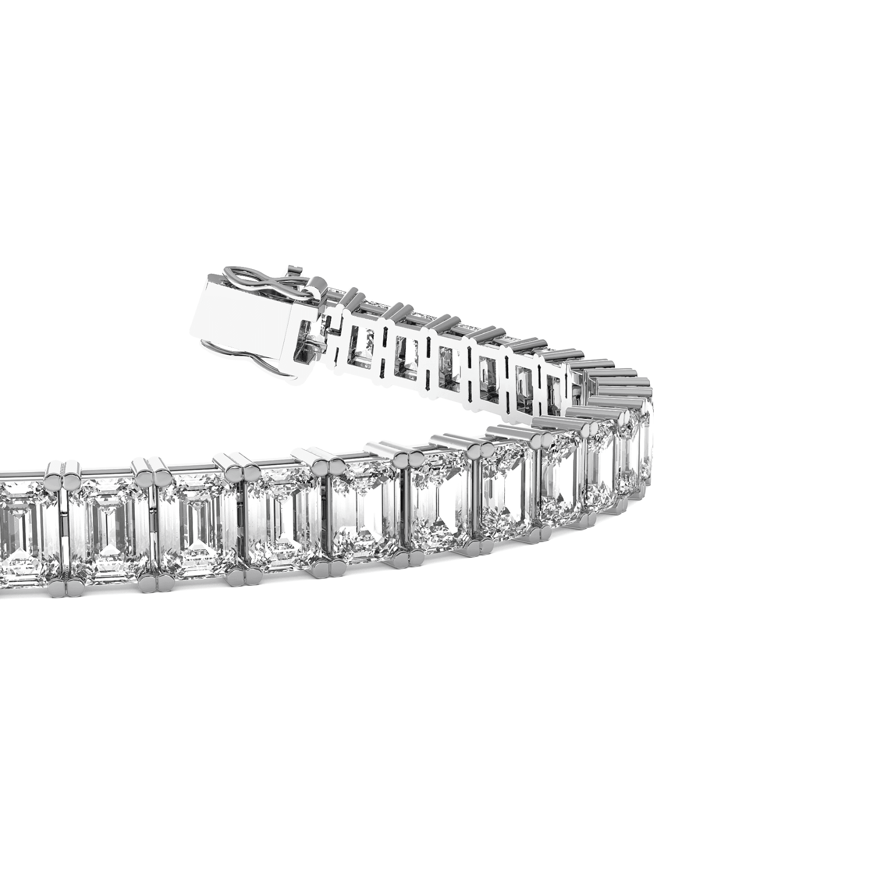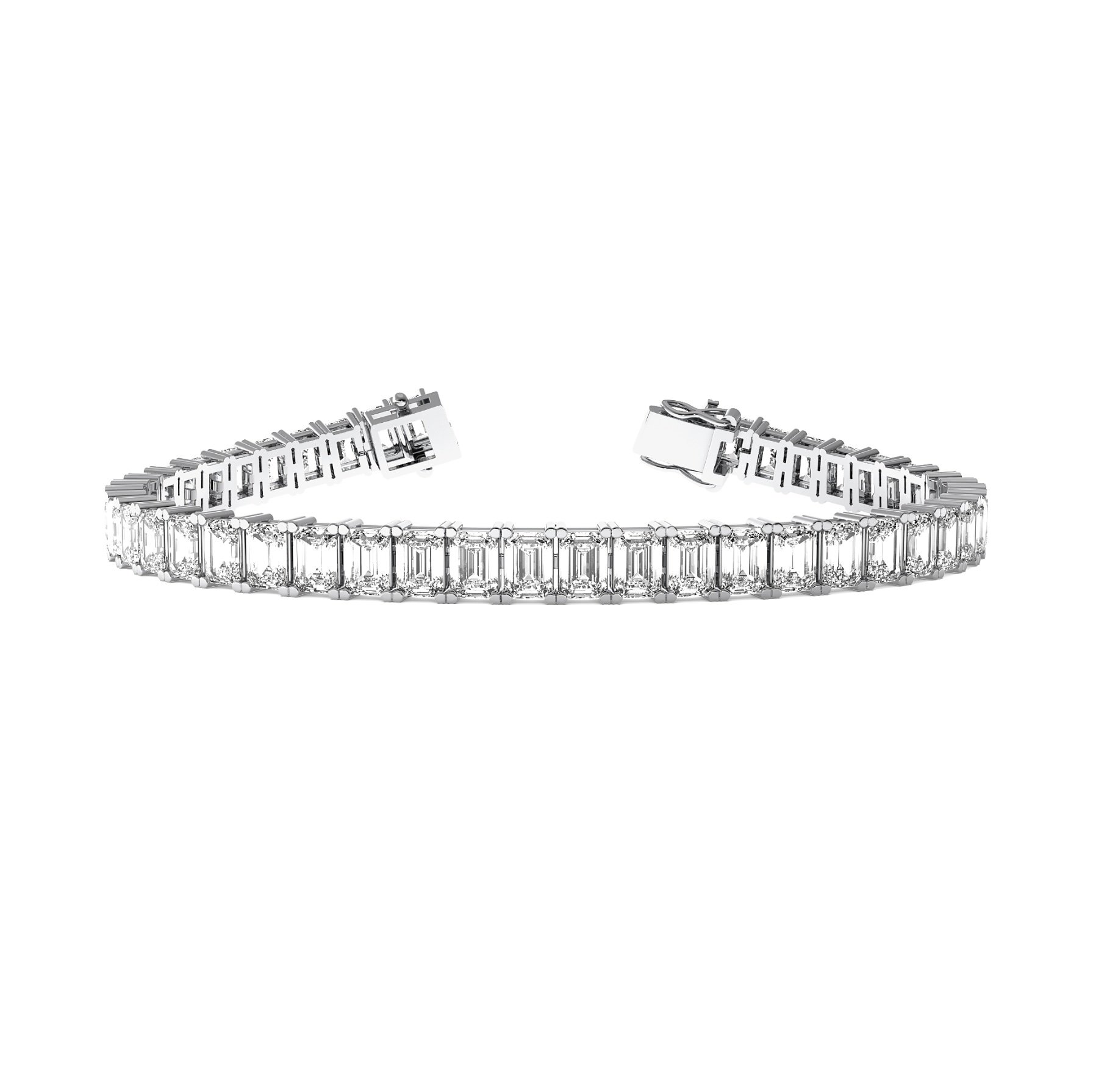 A timeless tennis bracelet featuring a continuous line of perfectly matched emerald-cut diamonds. Each stone is secured in a refined setting, creating a sleek, uninterrupted design that emphasizes the clean geometry and elegant sparkle of the emerald cut. Finished with a secure clasp, this bracelet is a classic expression of sophistication and everyday luxury.