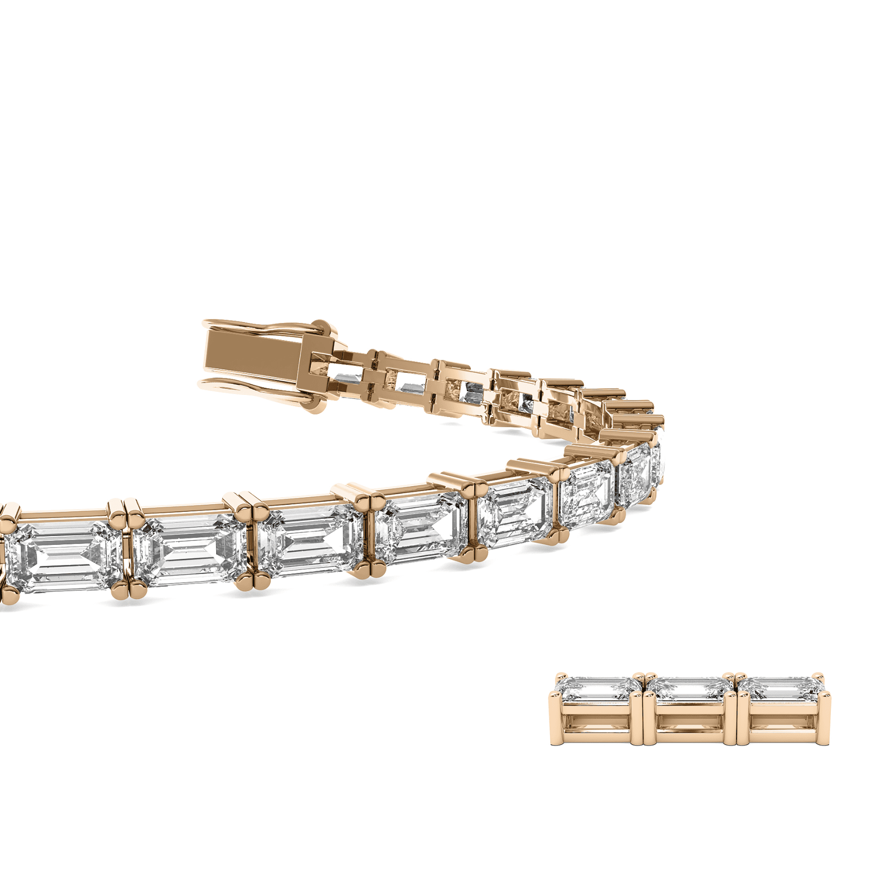 A timeless tennis bracelet featuring a continuous line of perfectly matched emerald-cut diamonds. Each stone is set east to west and secured in a refined setting, creating a sleek, uninterrupted design that emphasizes the clean geometry and elegant sparkle of the emerald cut. Finished with a secure clasp, this bracelet is a classic expression of sophistication and everyday luxury.